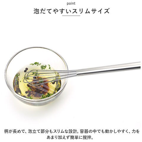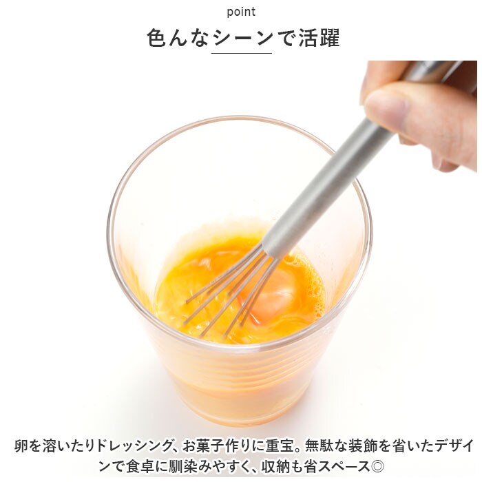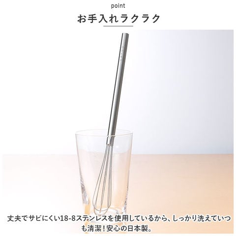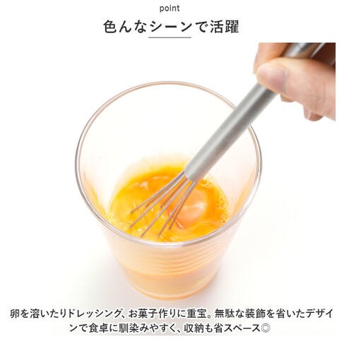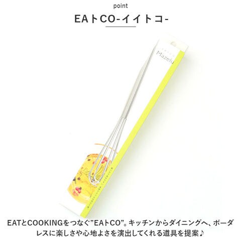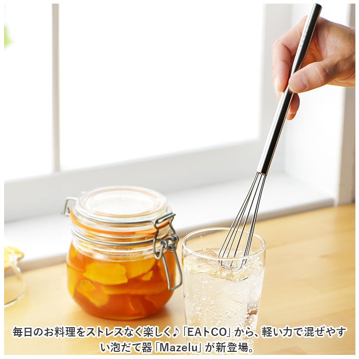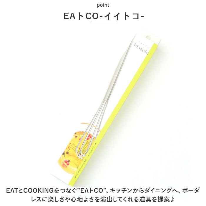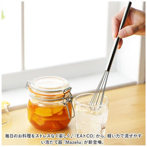| 商品説明 | 毎日のお料理をストレスなく楽しく♪「EAトCO」から、軽い力で混ぜやすい泡だて器「Mazelu」が新登場。【EAトCO-イイトコ-】EATとCOOKINGをつなぐ”EAトCO”。キッチンからダイニングへ、ボーダレスに楽しさや心地よさを演出してくれる道具を提案♪【泡だてやすいスリムサイズ】柄が長めで、泡立て部分もスリムな設計。容器の中でも動かしやすく、力をあまり加えず簡単に撹拌。【色んなシーンで活躍】卵を溶いたりドレッシング、お菓子作りに重宝。無駄な装飾を省いたデザインで食卓に馴染みやすく、収納も省スペース◎【お手入れラクラク】丈夫でサビにくい18-8ステンレスを使用しているから、しっかり洗えていつも清潔!安心の日本製。 |