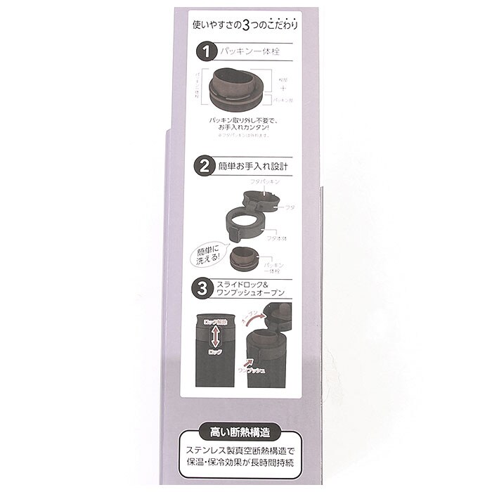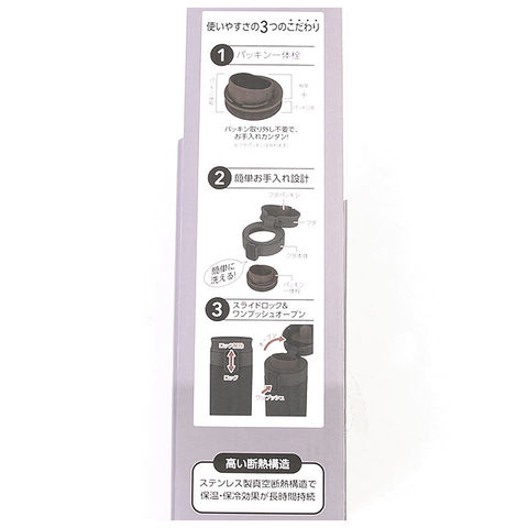 | 保温効力 | 89度以上(1時間) 70度以上(6時間) ※保温効力とは、室温20度において、本体容器に熱湯を0.5Lまで満たし、フタをした状態で湯温が95度の時から1時間及び6時間放置した場合におけるその湯の温度です。 |