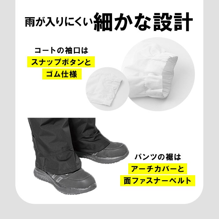 | 商品説明 | 【雨の日も快適に!】雨の日の移動やアクティブシーンに大活躍!「Makku パノラマバッグインレインスーツ」【優れた耐水圧と透湿度】耐水圧10,000mmH2Oと透湿度5,000g/m2-24hr。強い雨にも負けない頼もしいアイテム。【リュックを背負ったままでもOK】コートの背中部分には、約30Lまで対応のリュックを背負ったまま着用できるファスナー付き。【ヘルメット対応のセーフティフード】上下左右、360度の動きにもフィット!視界を遮る心配がないストレスフリーな立体設計。【フィット感の調節OK】顔まわりと首元をしっかりフィットさせる調節コード&後頭部にある面ファスナーテープでフードを調節。【フードを収納】フードを使わない時はくるくるッとまるめてテープで留めればスッキリとフードを収納可能。【雨風をシャットアウト】袖口はスナップボタン&ゴム仕様。フロントはファスナー&スナップボタンで雨からしっかりガード。【視認性UP!反射プリント】バックには視認性を高める反射プリント付き。薄暗い雨の日も安心。【便利なポケット】両サイドには雨水が入りにくいフラップ付きのポケットを配置。【環境に配慮した撥水加工】表生地は環境に配慮した非フッ素撥水の撥水剤を使用。【裏側加工で高い防水性】縫い目の裏側はシームテープ加工で雨水の浸入をしっかり防止。【パンツにもこだわり】パンツの裾はアーチカバーと面ファスナーベルトで靴の隙間から水滴の浸入をしっかり防ぐ!【ユニセックス仕様】レインコートとパンツの上下セット。雨の日、自転車での通勤・通学やお買い物も安心! |