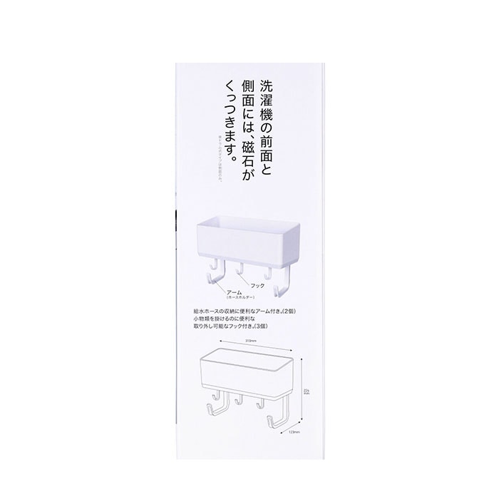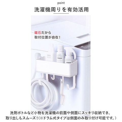 | 商品説明 | 磁石で洗濯機にくっつけるだけ!取り付け簡単で便利なフリーラック(ホースホルダー付き)が登場!【洗濯機周りを有効活用】洗剤ボトルなど小物を洗濯機の前面や側面にスッキリ収納でき、取り出しもスムーズ!(※ドラム式タイプは側面のみ取り付け可能です。)【取り付け簡単】マグネットタイプだから取り付けが簡単で、位置変更も自在にOK!【3個のフック付き】洗濯ネットなどを引っかけるのに便利な取り外し可能なフック付き。(※フック1個につき0.3kgまで)【ホースホールダー付き】置き場所に困る給水ホルダーをまとめて掛けられるアームが2個付属。(※アーム1個につき0.5kgまで)【シンプルデザイン】インテリアになじむスマートなデザインとスタイリッシュなフォルム。 |