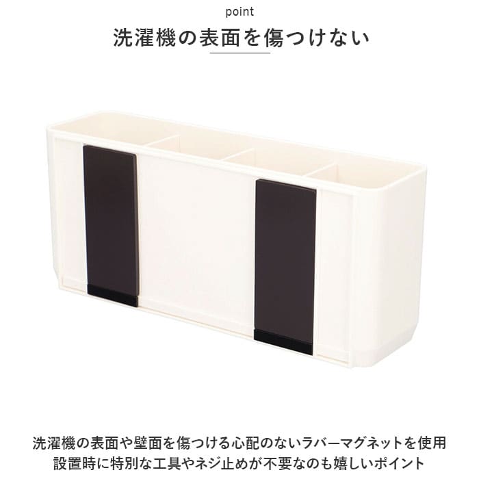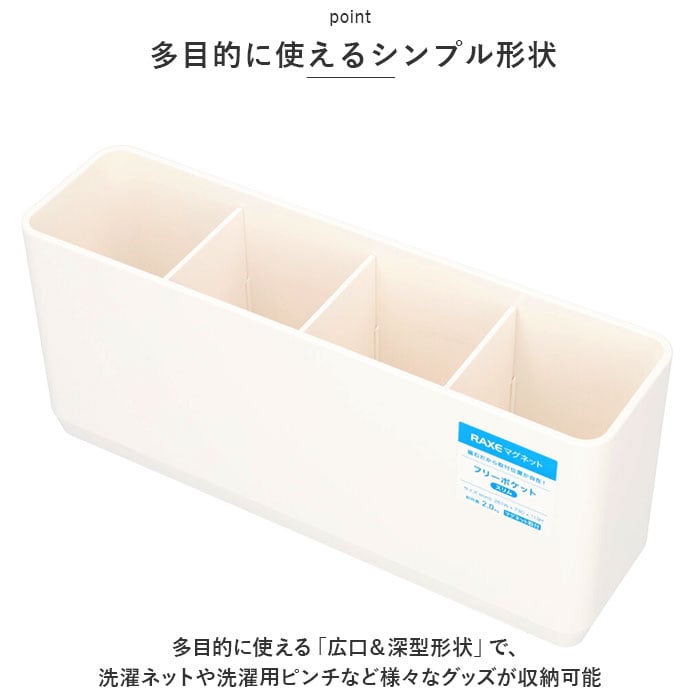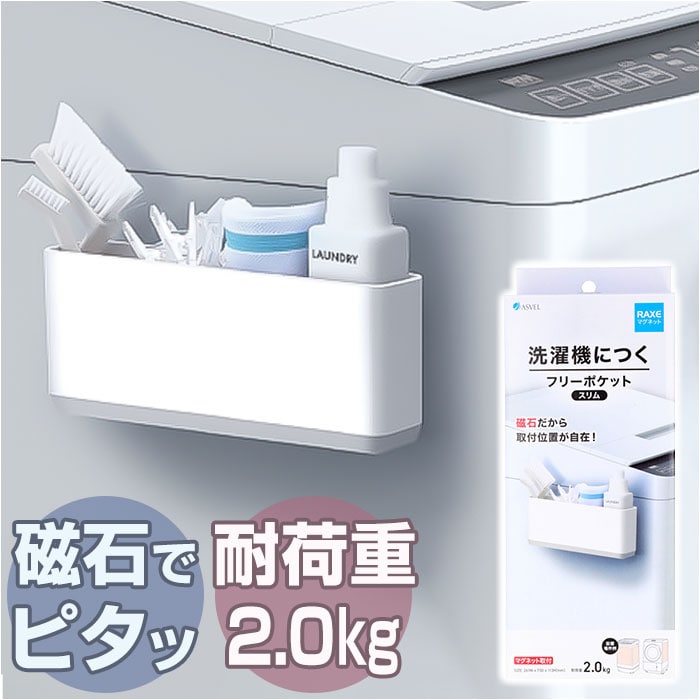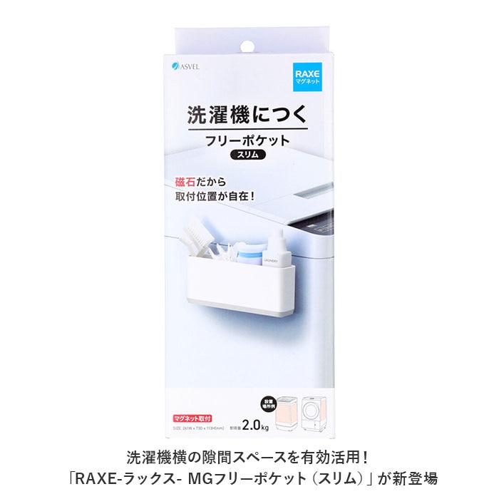 | 商品説明 | 洗濯機横の隙間スペースを有効活用!サニタリールームがすっきり片付く「RAXE-ラックス- MGフリーポケット(スリム)」が新登場。【磁石の力でピタッと取付け】フリーポケットの背面のマグネットシートで、洗濯機の側面や前面にピタッとくっついて、取り付け位置の調整も自在。(※ドラム式タイプの洗濯機は側面のみの取り付けとなります。)【多目的に使えるシンプル形状】多目的に使える「広口&深型形状」で、洗濯ネットや洗濯用ピンチ・掃除用スポンジなど様々なグッズが収納可能。【仕切りでカスタマイズ自在】付属の仕切りプレートは、収納するアイテムの大きさに合わせて取り外しが自在。掃除用ブラシやスプレー缶のようなスティック状のアイテムもすっきり収納。【洗濯機の表面を傷つけない】洗濯機の表面や壁面を傷つける心配のないラバーマグネットを使用。設置時に特別な工具やネジ止めが不要なのも嬉しいポイント。【耐荷重2.0kg】耐荷重2.0kgまで対応したタフなつくりで、洗濯用洗剤や柔軟剤のボトルなど少し重みのある物を収納しても大丈夫!【清潔感のあるカラーリング】ホワイト1色のすっきりとしたモノトーンカラーが、サニタリールームを落ち着いた雰囲気に演出!【様々な場所でマルチに活躍】ユニットバス壁面や洗面化粧台のキャビネットなど、鋼板を内蔵した壁面であればどどこにでも気軽にセッティング可能。使い方はアイディア次第♪ |