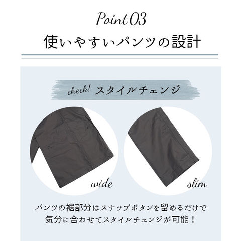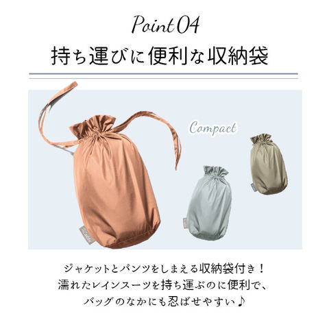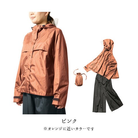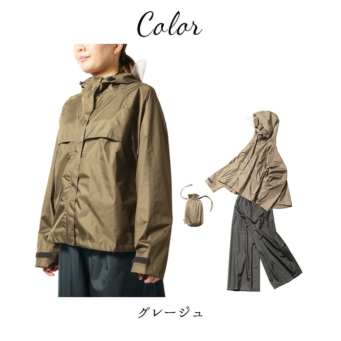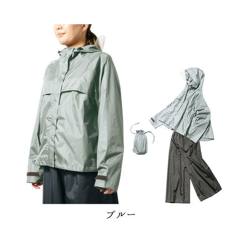 | 素材 | [ジャケット]ポリエステル100%(ポリウレタン透湿コーティング) [パンツ]ポリエステル100%(ポリ塩化ビニル引き) ※はっ水(水をはじきやすい) [付属品]収納袋 |
