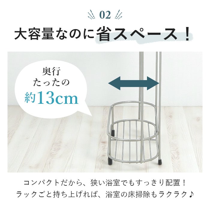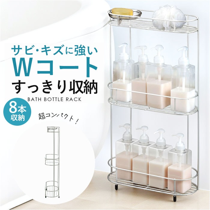 商品説明浴室のバス用品をまとめて置ける収納ラック!「Wコート ワイドラック」3段タイプが発売。ボトルの床置きは底面に水アカやぬめりが溜まってしまったり、床掃除の際に移動する手間が面倒…そんな悩みを解決してくれる浴室収納ラック。ファミリー向けの大容量3段タイプ♪シャンプーボトルは約8本収納可能で、トリートメントなどのヘアケア用品なども置いておける。さらに上段には石けんトレー付きなので、固形ソープの置き場にも困らない◎ラック本体のスチール線材は、カラーコートとクリアコートを2重に施したWコート仕様。キズやサビに強く、清潔に長く使えるのが嬉しいポイント。脚は滑り止め付きで、床が濡れて滑りやすい浴室でも安心。さらに付属の補助吸盤を使って壁面に固定することで、ラックの転倒防止に!ラックごと持ち上げれば、浴室の床掃除もラクラク♪[付属品]石けんトレー・吸盤1個・吸盤取付金具1個