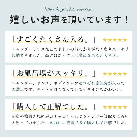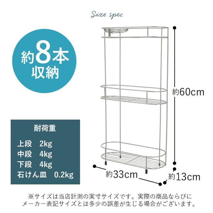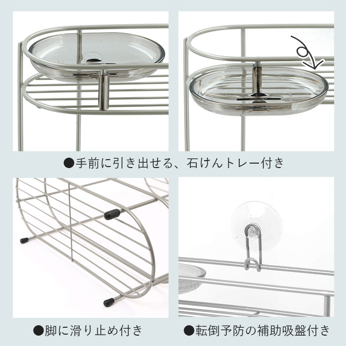 注意点不安定な場所でのご使用はお避けください。棚に物をのせる時は安定性をよくする為に、下段に重い物をのせてください。吸盤で固定する場合は、吸盤や壁面の汚れ・水分などをきれいに取り除いてください。吸盤は表面がザラザラ、凹凸、キズのあるところには付きません。吸盤が変形して付きにくいときは、熱湯に約5分浸した後、乾かしてご使用ください。(熱湯の扱いには充分ご注意ください。)取り付けが安全・確実かどうか時々ご点検ください。耐荷重を守ってご使用ください。万一の場合に備え、貴重品やこわれやすい物はのせないでください。材質の劣化を早める場合がありますので、石けん皿・スベリ止めには浴室用洗剤・カビ取り剤・漂白剤等を使用しないでください。また、付着した場合は充分洗い流してください。本体(鉄)は、樹脂コーティングを施してありますが、キズ等が付いてコーティングがはがれてしまいますと、サビの原因となります。カメラやモニターの性質により、画像と実物の色の違いがある場合がございますのでご理解願います。