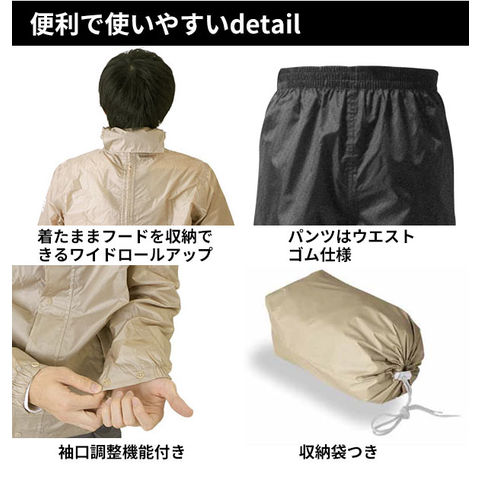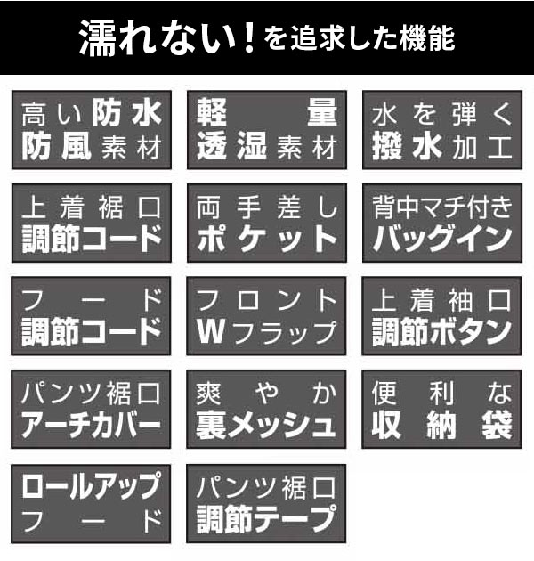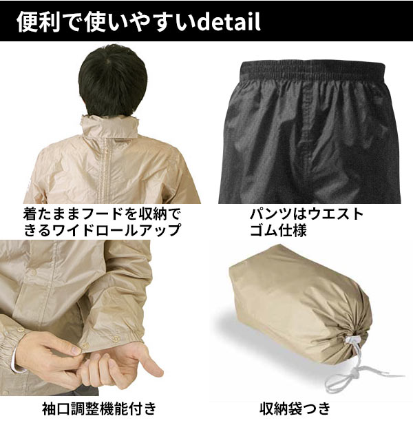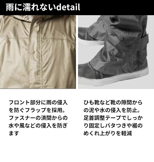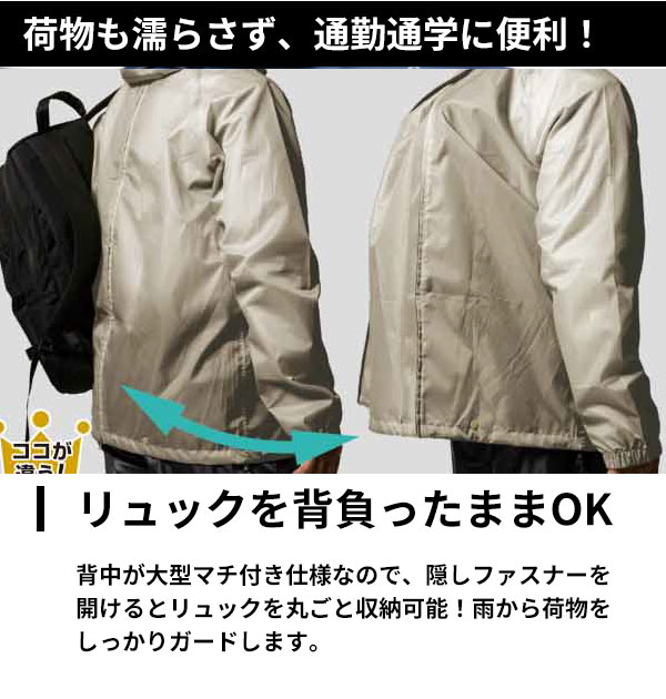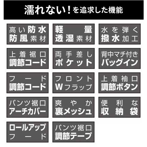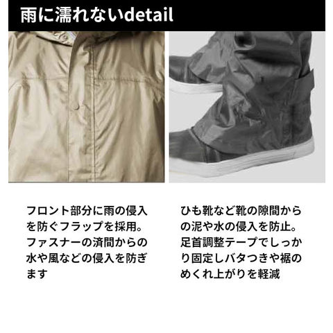 | 商品説明 | マックの軽量透湿レインスーツ。背中が大型マチ付き仕様なので、隠しファスナーを開けるとリュックを丸ごと収納可能!雨から荷物をしっかりガードします。総裏メッシュ付きなので、雨でもムレにくく快適。シープテープ加工で、水滴の侵入を防ぎます。裾部はアーチカバー調節テープ付で、靴のすき間から泥や水が浸入するのを防止。バタつきや裾上がりを軽減します。着たままでもフードを丸めて簡単収納、ワイドカバーで固定出来て便利です♪ |