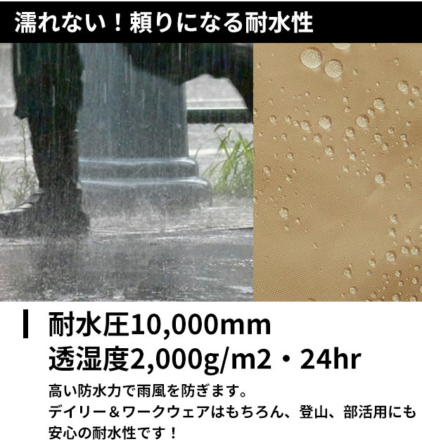 | 素材 | ポリエステル100パーセント(ポリウレタン透湿コーティング)、ポリエステル100パーセントメッシュ 耐水圧10000mmH2O、透湿度2000g/m2-24h |