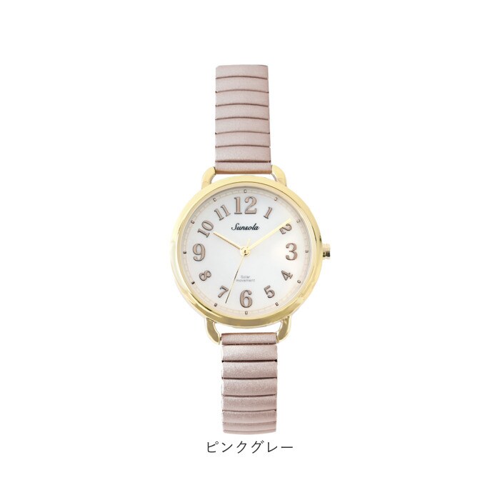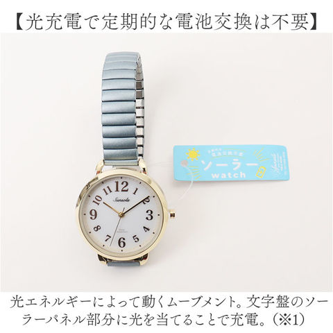 | 商品説明 | 【アクセサリー感覚なのに機能的】ブレスレットのような着用感♪ソーラームーブメント仕様の腕時計「サニジャ」。【光充電で定期的な電池交換は不要】光エネルギーによって動くムーブメント。文字盤のソーラーパネル部分に光を当てることで充電。(※1)長時間の直射日光での充電は避けてください。【ワンタッチで簡単に着脱OK】ソフトでぐ~んと伸びるジャバラタイプで、付け外しがスムーズ。忙しい朝も一瞬で装着完了。【視認性の高いシンプルな文字盤】時刻を確認しやすい文字盤デザイン。文字盤ケース横のつまみで、簡単に時刻調節が可能。【安心の日本製ムーブメントを採用】ムーブメントは高い性能を誇る日本製。1秒ごとに時を刻むステップ秒針。(※2)秒針が2秒ごとに動くと、充電不足のサインです。【自分用にもギフトにもおすすめ】可愛らしいカラーリングで、手元をさりげなく彩るウォッチ。贈り物にも喜ばれそう! |