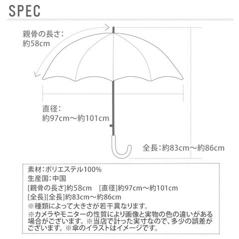 | サイズ | [親骨の長さ]約58cm [直径]約97cm [全長]約83cm ※サイズは当店平置き実寸サイズです。実際の商品とは多少の誤差が生じる場合がございます。あらかじめご了承ください。 |