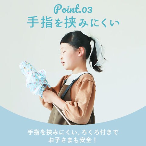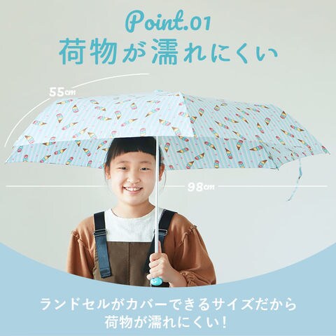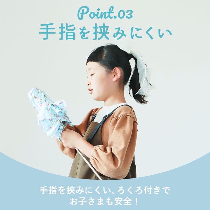| 商品説明 | パステル調の生地に散りばめたモチーフがとってもキュート!ミニポンジー、ガールズ用折りたたみ傘。開閉時に傘骨をポキポキと折りたたむ手間のない、簡単開閉タイプ。3段式にたためてコンパクトに持ち運べる!キッズ用コンパクト傘ながら、傘生地は直径約98cm親骨約55cmサイズに広がり、ランドセルもしっかりカバー!お子さまが手指を挟みにくいよう配慮された安全ろくろ付きで、傘生地がスムーズに開閉できる手開きタイプ。重さ約180gと驚くほど軽い♪折りたたみ時のサイズは約24cmで、ランドセルやレッスンバッグの中でも邪魔にならないコンパクトサイズ。傘生地にはアイスクリームやコスメなど、女の子らしいアイテムを散りばめたデザインで、雨の日の学校も楽しくお出かけできる♪ |