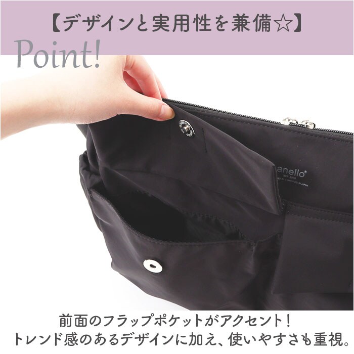 | 商品説明 | 【収納力◎お出かけの心強い味方】荷物をざっくりひとまとめ。anelloのアビーシリーズから、ショルダーが新登場。【デザインと実用性を兼備☆】前面のフラップポケットがアクセント!トレンド感のあるデザインに加え、使いやすさも重視。【両手が空いてストレスフリー】長さ調節可能なショルダーベルトを使って、肩掛けや斜め掛け。アクティブに動く日も快適。【開閉スムーズなダブルファスナー】左右どちらからもオープン!出し入れしやすく、ファスナーを閉じれば、プライバシーも確保◎【A4サイズ対応のすっきりフォルム】A4サイズが横向きにすっぽり。収納力がありつつ、程よいマチで人混みでも邪魔になりにくい!【サッと取り出せて迷子知らず】内側と外側に7個のポケットを配置。バッグの中で小物を探す手間が不要。【体に負担をかけない軽量設計】軽やかな使い心地で、移動の多い日も安心。旅行やレジャー、通学などでも重宝。【ちょっとの雨なら大丈夫】汚れや水滴を弾きやすい、両面撥水加工済み。お手入れも拭き取るだけ。(※)完全防水ではありません。【お気に入りを選べるカラー】年代や性別問わず持ちやすいカラーをラインナップ。色違いで揃えるのもおすすめ!【ポケット仕様】内側:ファスナーポケット×1、オープンポケット×2前面:マグネット式フラップポケット×2サイド:ギャザーポケット×2 |