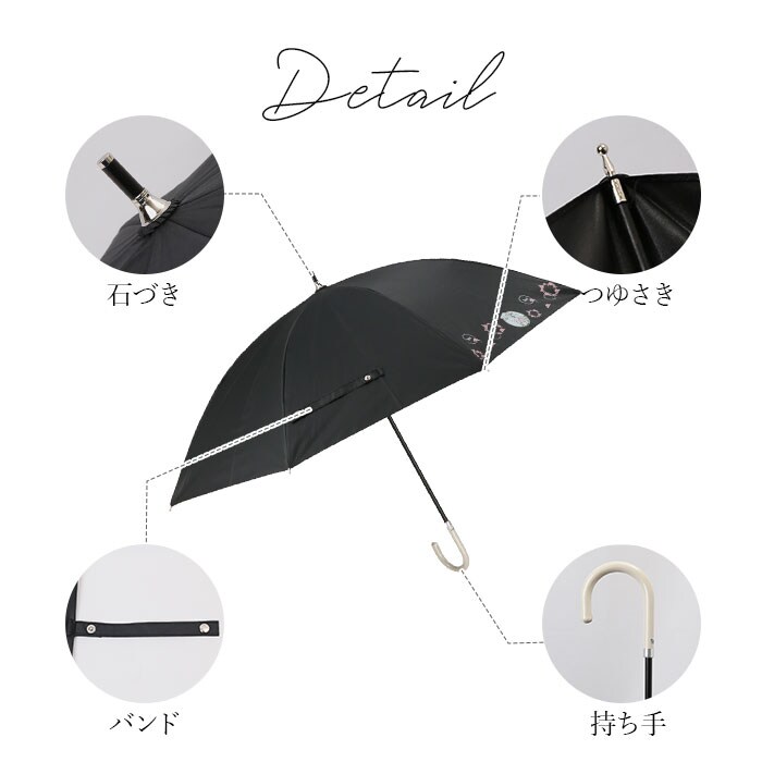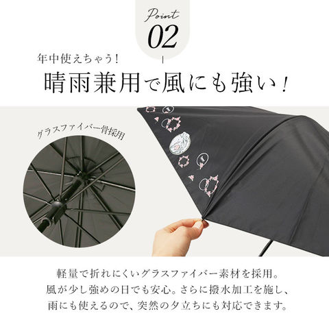 | 商品説明 | 雨の日も晴れの日も使える♪キャラクターの絵柄が可愛らしい、雨晴兼用傘が発売。(親骨47cmタイプ)親骨に弾力性があり折れにくいグラスファイバー素材を使用しているので、風が少し強めの日でもちゃんとさせて安心。傘生地の内側にはブラックコーティング加工を施し、UPF50+、UV99%カット、遮光率99.5%以上!開閉時に指先や爪を挟むのを防止する安全ろくろ付きで、スムーズに開閉できる手開きタイプ。傘生地を留めるバンドは、パチンッと留めやすいスナップボタン式。手元ハンドル部分には合皮レザーを採用し、上品な印象を演出。(※カラーにより、ハンドルの色が異なります。)軽量で小ぶりなサイズなので、ラクラク持ち運べる! |