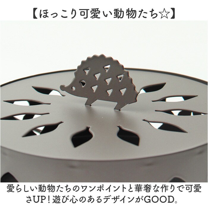 | 商品説明 | 【動物たちとおしゃれに虫よけ♪】デイリー使いもレジャーもおまかせの、可愛い相棒♪「atellier No.11 蚊遣り箱」が登場。【まるでインテリアのような佇まい】蚊取り線香に見えない、くすみカラーとマットな質感でおしゃれ見せ♪雑貨好きな方にオススメ!【ほっこり可愛い動物たち☆】愛らしい動物たちのワンポイントと華奢な作りで可愛さUP!遊び心のあるデザインがGOOD。【誰でもすぐに使える簡単設置】スタンドに蚊取り線香を乗せるだけの、簡単設置。かけらになっても挟めるスタンドが便利。【扱いやすいハンドルつき】持ち運びがしやすく、吊るしての使用もOKなハンドルつきタイプ。いろんな場所に置ける。【スタイリッシュカラーがGOOD】空間に馴染むナチュラルカラーで、ほどよく甘さをセーブ。お好みの1つをチョイス。【夏のちょっとしたギフトにも】シンプルでいておしゃれな専用BOX入り。ちょっとしたギフトにもオススメのアイテム。【いろんな場所で大活躍】リビング、玄関、庭先に。コンパクトだから、アウトドアなどのレジャーに持っていくのも◎ |
