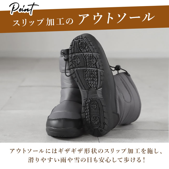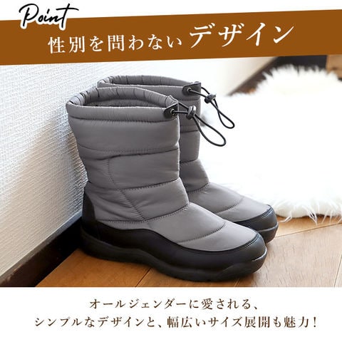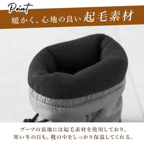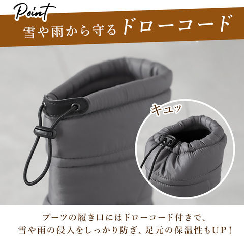| 商品説明 | シンプルなスタイルのANYWALK(エニーウォーク)防寒ダウンブーツ。レディースからメンズまで幅広いサイズ展開のユニセックスアイテム。上部のドローコードを絞れば、雨や雪の侵入を防げる仕様。裏地には起毛素材を使用しているので、寒い冬の日も靴の中をしっかり保温してくれる。アウトソールにはギザギザ形状のスリップ加工を施しており、滑りやすい雨や雪の日も安心。防寒ブーツ、スノーブーツとして大活躍の一足♪ |