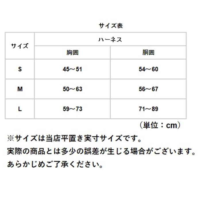 | サイズ | [ドッグ用ハーネス] ・Sサイズ ・Mサイズ ・Lサイズ ※サイズについて詳細は、サイズ表をご覧くださいませ。 |
