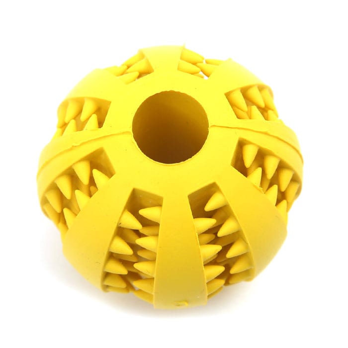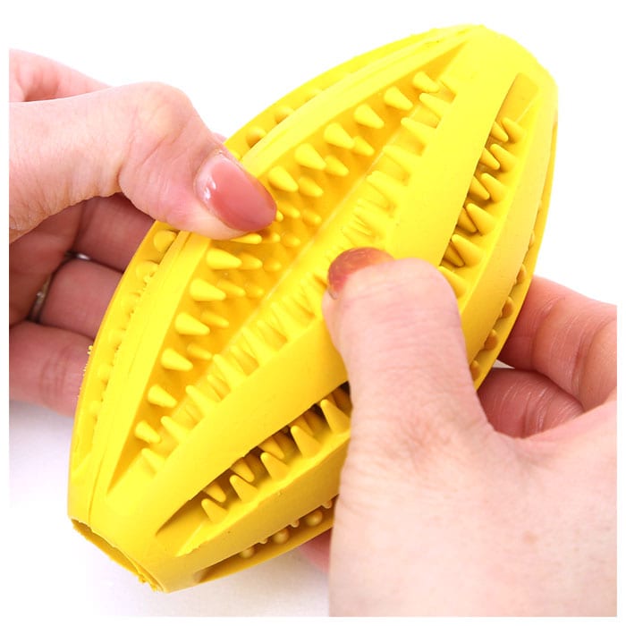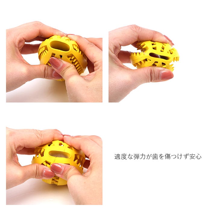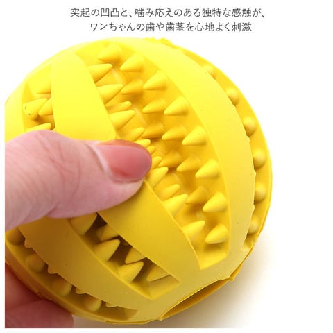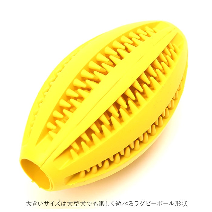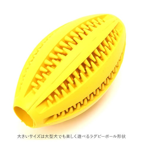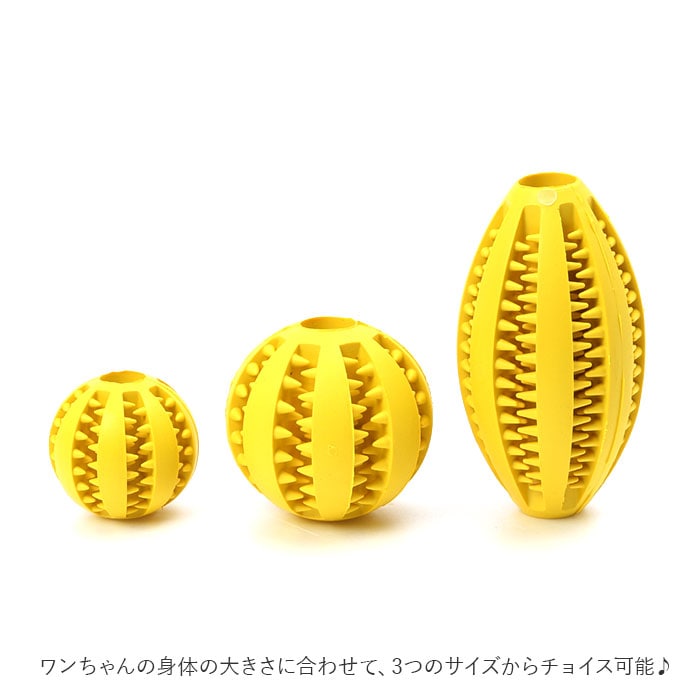 | 商品説明 | かじって転がるたびに、ポロポロとこぼれるおやつに大興奮!ワンちゃん大喜びの噛むボールおもちゃ!柔らかなゴム素材のボールに突起の付いた溝を刻んだ「噛む力をきたえる」ワンちゃん用のおもちゃ。適度な弾力が歯を傷つけず、いっぱい噛んでも安心な天然のゴム素材を使用。突起の凹凸と、噛み応えのある独特な感触が、ワンちゃんの歯や歯茎を心地よく刺激し、歯のむずがゆさを防止!ほんのり香る、ミントの香りが爽やか。互い違いに突起の並んだ溝に、ワンちゃんお気に入りのドライフードを入れておけば、遊びながらおやつタイムが楽しめる。ポロポロと少しずつフードが転がり出るので、食べ過ぎを防ぐ効果も♪飼い主さんがお留守中のひとり遊び用や、運動不足解消にも役立つ!家具やソファへの噛みキズ予防にもオススメ。小型犬から大型犬まで、ワンちゃんの身体の大きさに合わせて、3つのサイズからチョイス可能♪小さいサイズはネコちゃん用に、大きいサイズは大型犬でも楽しく遊べるラグビーボール形状。 |