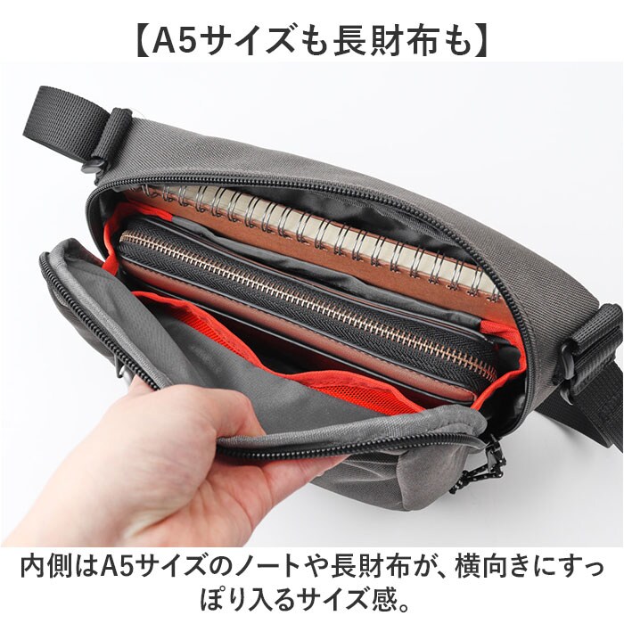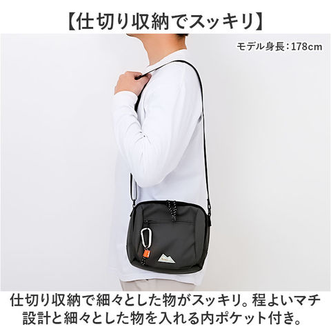 | 商品説明 | 【仕切り収納でスッキリ】仕切り収納で細々とした物がスッキリ。程よいマチ設計と細々とした物を入れる内ポケット付き。【ユニセックスで使えるデザイン】シンプルを極めたスタイリッシュデザイン!ユニセックスで使えるカラーラインナップ!【コンパクトだけどたっぷり収納◎】絶妙なサイズ感がポイント。お出かけに必要な荷物をまるっと収納して身軽にお出かけできる!【A5サイズも長財布も】内側はA5サイズのノートや長財布が、横向きにすっぽり入るサイズ感。【安心のファスナー開口】開口部はファスナー式。中身がこぼれ落ちることなく、プライバシーを確保。【サッと取り出せるポケット】外側前後にポケットを配置。使用頻度の高い小物を入れておけて迷子になりにくい!【長時間の移動もラクラク】身体に負担がかかりにくい軽量設計。両手が空くので、自転車移動やお子さまとのお出かけにも!【軽くて丈夫なのでガシガシ使える】バッグの重さはカラビナ含んでもわずか約208gと軽量!デイリーからアクティブシーンにも活躍◎【ちょっとの雨なら大丈夫】表面は汚れや水滴を弾く撥水加工済。お手入れもサッとでOK。(※完全防水ではありません。)【ポケット仕様】フロント:ファスナーポケット×1メイン収納:オープンポケット(メッシュ)×2背面:オープンポケット×1 |
