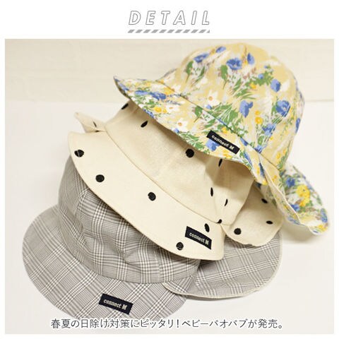 | 商品説明 | 春夏の日除け対策にピッタリ!ベビーバオバブが発売。つばと日よけカバー付きで赤ちゃんの肌を紫外線からしっかりガード。芯材が入っていない柔らかいつばなので、使わないときはコンパクトに折りたためる◎バックはギャザー入りで頭に優しくフィット。安心の日本製。綿100%の生地を使用。(※アイボリーは裏地のみ綿100%です。)アゴ部分には風で飛ばされにくいやわらかなゴム付き。手洗いOKなのでお手入れ簡単でいつでも清潔。豊富なバリエーションで出産祝いやお誕生日プレゼントにもおすすめ♪ |