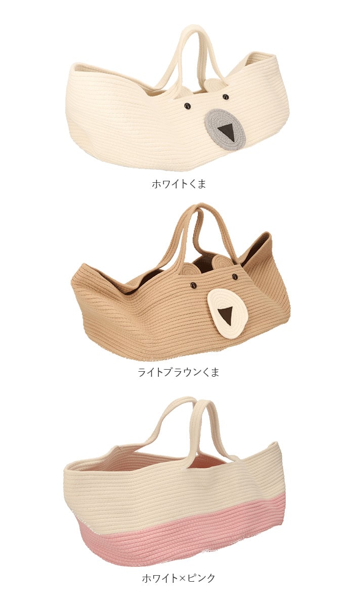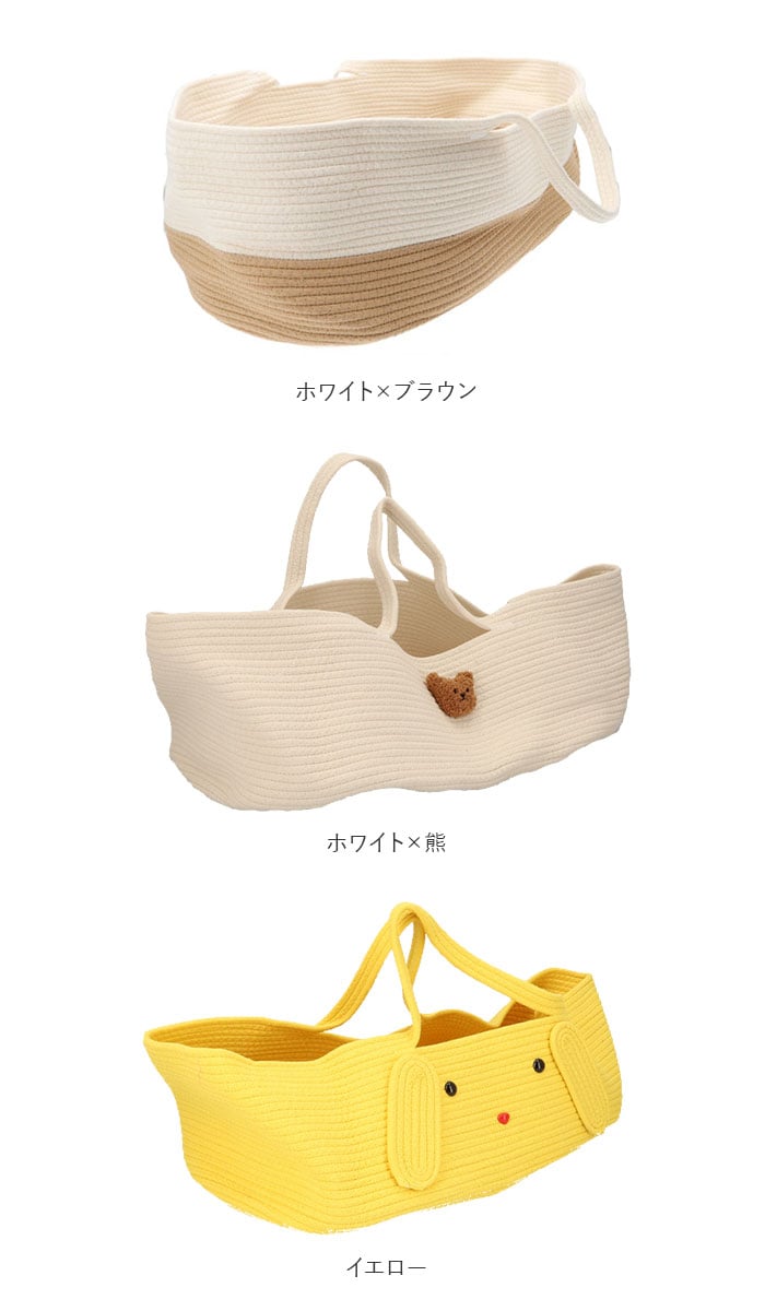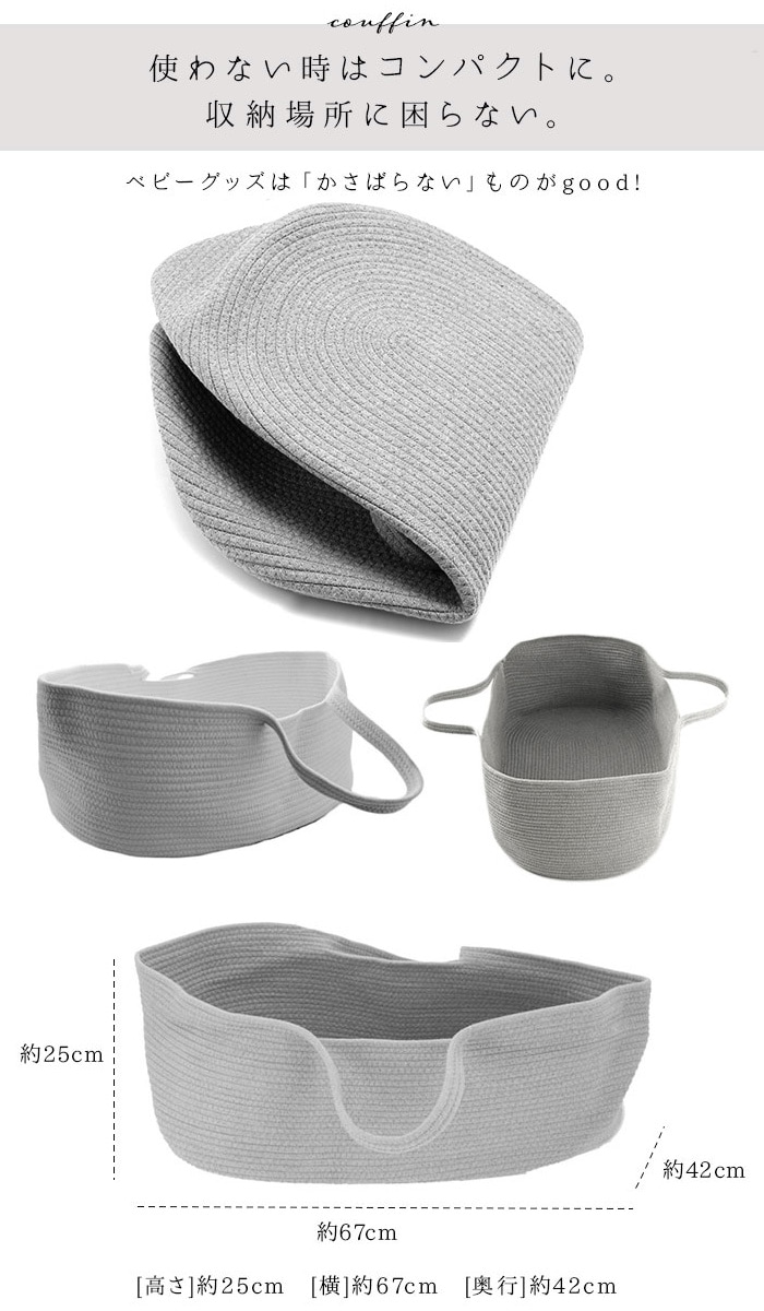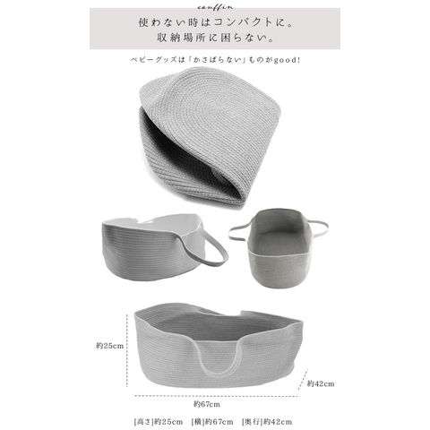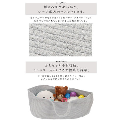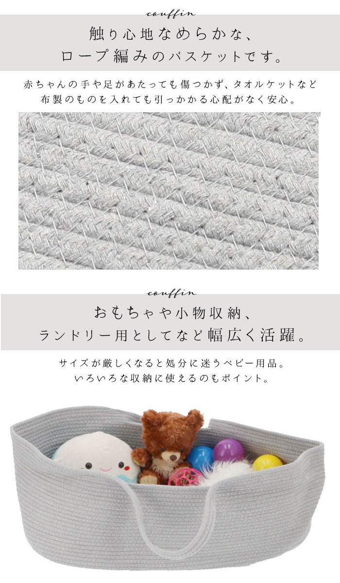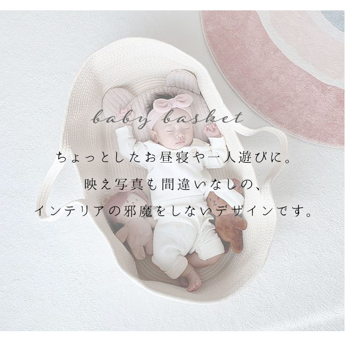 | 商品説明 | 赤ちゃんがゆっくりお休みできる♪ベビーバスケットが発売。触り心地なめらかなロープ編みのバスケット。赤ちゃんの手や足があたっても傷つかず、タオルケットなど布製のものを入れても引っかかる心配がないから安心。使わない時は折りたたんで、コンパクトに収納可能。持ち手付きで、持ち運びもラクラク。ベビー用のクーファンとしてだけでなく、お子さまのおもちゃや小物収納、ランドリーバスケットとしてなど幅広く活躍。シンプルなデザインに、インテリアの邪魔をしないベーシックカラーをラインナップ♪ |