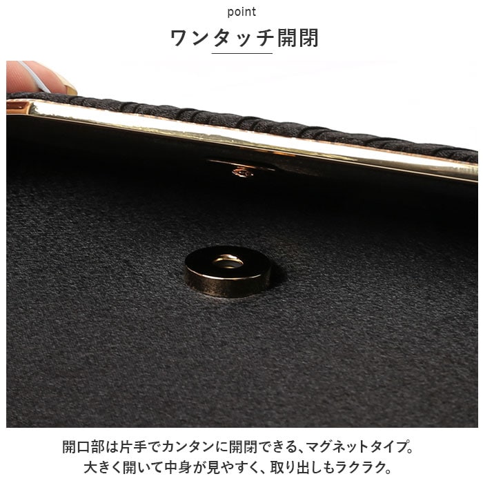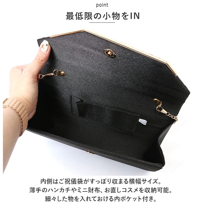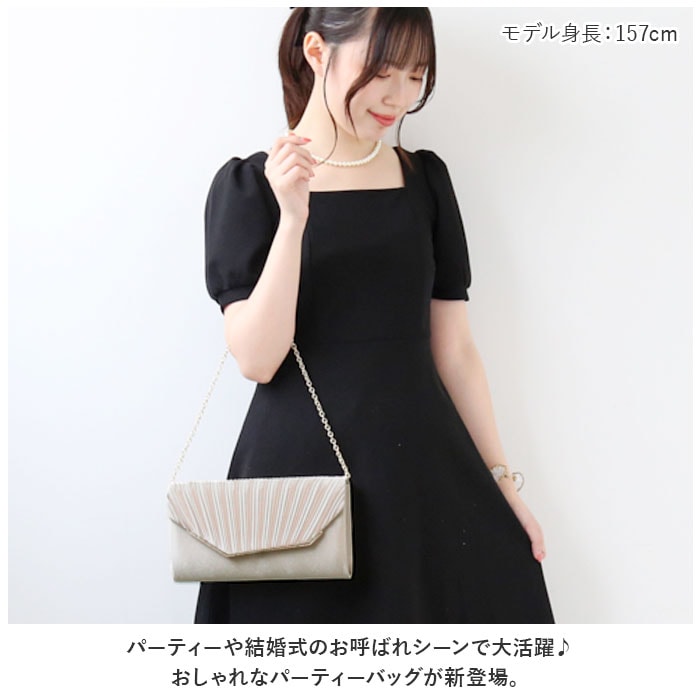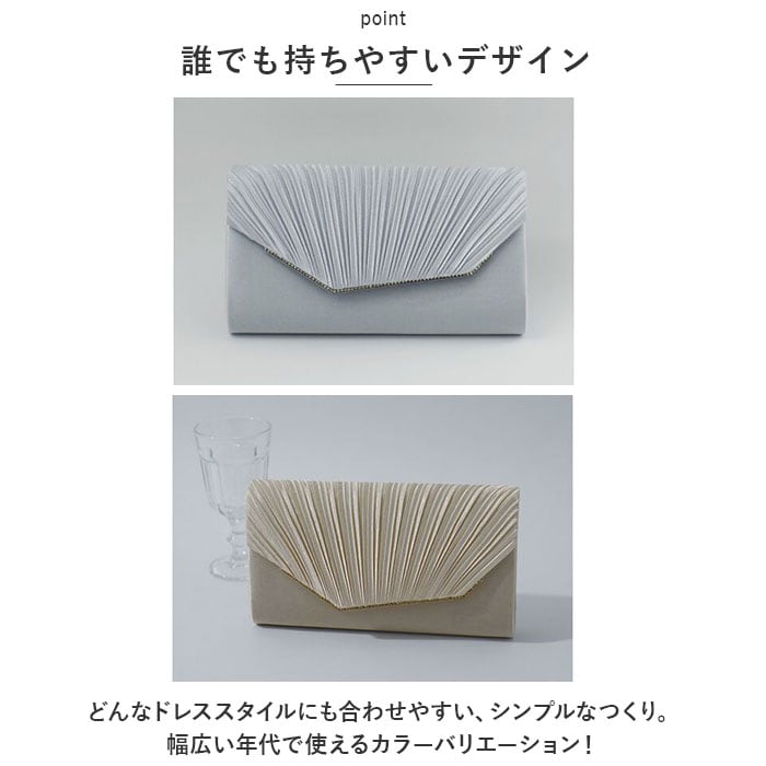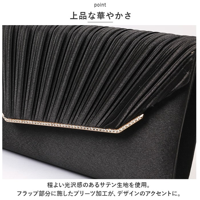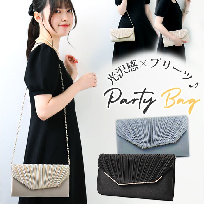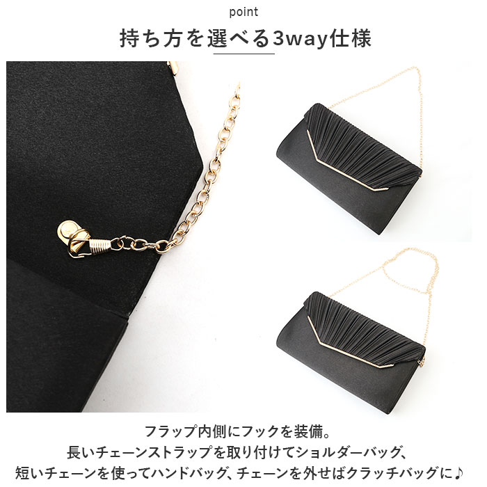 | 商品説明 | パーティーや結婚式のお呼ばれシーンで大活躍♪おしゃれなパーティーバッグが新登場。【上品な華やかさ】程よい光沢感のあるサテン生地を使用。フラップ部分に施したプリーツ加工が、デザインのアクセントに。【持ち方を選べる3way仕様】フラップ内側にフックを装備。長いチェーンストラップを取り付けてショルダーバッグ、短いチェーンを使ってハンドバッグ、チェーンを外せばクラッチバッグに♪【ワンタッチ開閉】開口部は片手でカンタンに開閉できる、マグネットタイプ。大きく開いて中身が見やすく、取り出しもラクラク。【最低限の小物をIN】内側はご祝儀袋がすっぽり収まる横幅サイズ。薄手のハンカチやミニ財布、お直しコスメを収納可能。細々した物を入れておける内ポケット付き。【誰でも持ちやすいデザイン】どんなドレススタイルにも合わせやすい、シンプルなつくり。幅広い年代で使えるカラーバリエーション! |