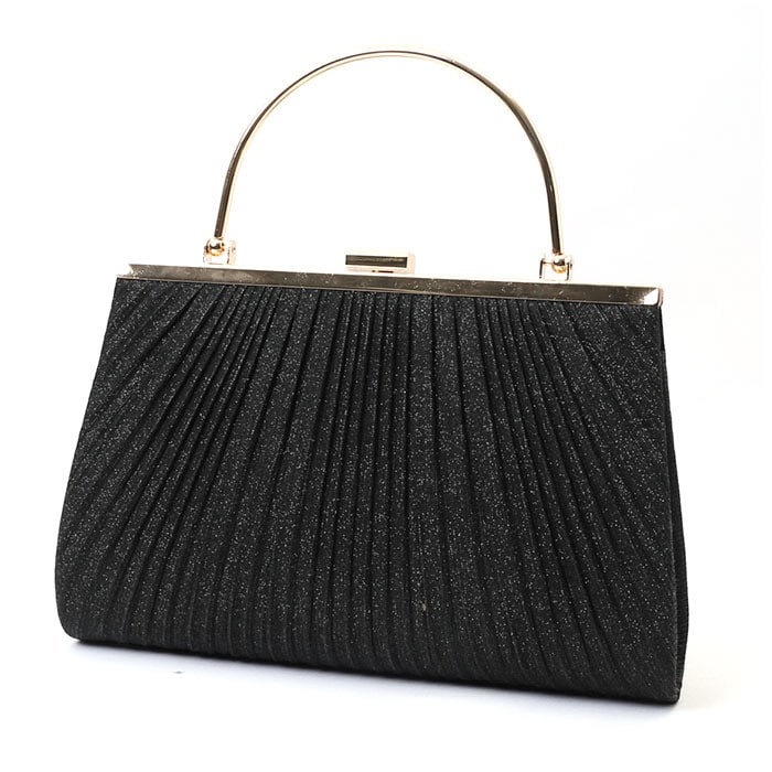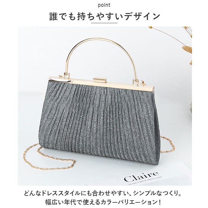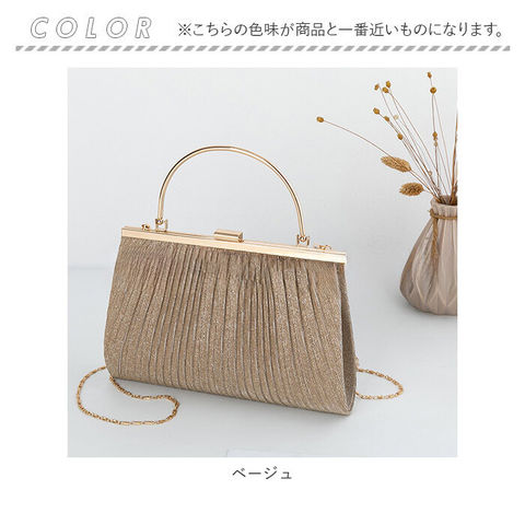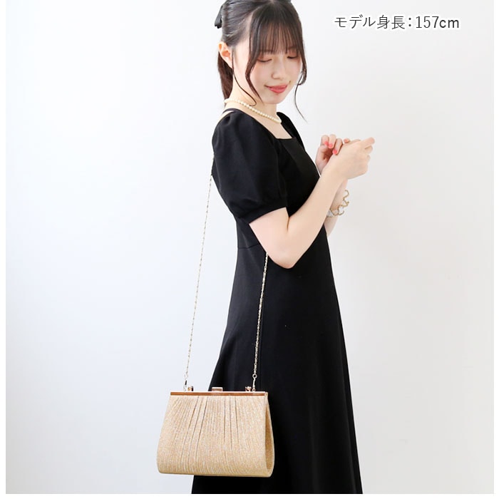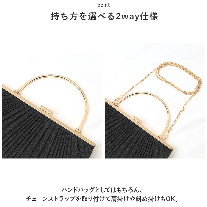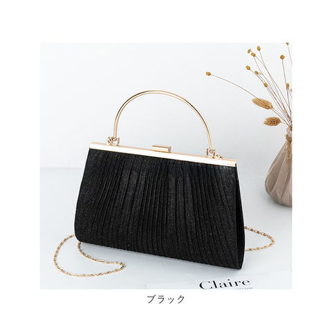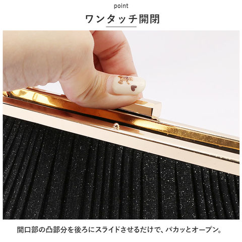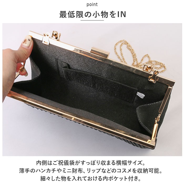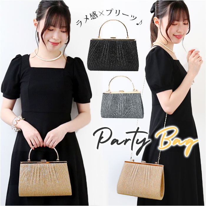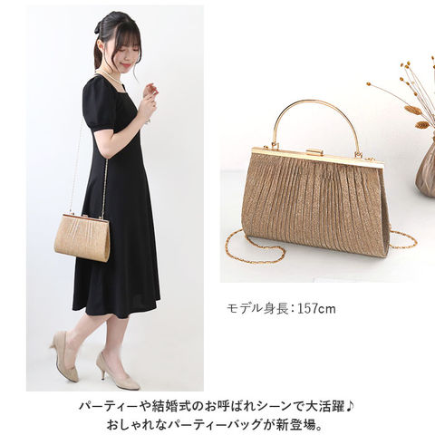 | 商品説明 | パーティーや結婚式のお呼ばれシーンで大活躍♪おしゃれなパーティーバッグが新登場。【上品な華やかさ】表面生地(前面のみ)にプリーツ加工を施し、ラメ感をプラス♪ゴールドの金具を組み合わせ、大人な印象に。【持ち方を選べる2way仕様】ハンドバッグとしてはもちろん、チェーンストラップを取り付けて肩掛けや斜め掛けもOK。【ワンタッチ開閉】開口部の凸部分を後ろにスライドさせるだけで、パカッとオープン。【最低限の小物をIN】内側はご祝儀袋がすっぽり収まる横幅サイズ。薄手のハンカチやミニ財布、リップなどのコスメを収納可能。細々した物を入れておける内ポケット付き。【誰でも持ちやすいデザイン】どんなドレススタイルにも合わせやすい、シンプルなつくり。幅広い年代で使えるカラーバリエーション! |