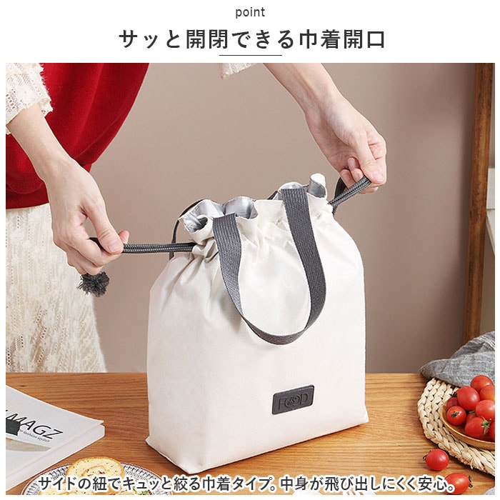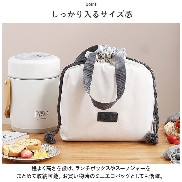 | 商品説明 | サッと持ち出してランチへGO♪使い勝手ばっちりなランチバッグが登場。【サッと開閉できる巾着開口】サイドの紐でキュッと絞る巾着タイプ。中身が飛び出しにくく安心。【しっかり入るサイズ感】程よく高さを設け、ランチボックスやスープジャーをまとめて収納可能。お買い物時のミニエコバッグとしても活躍。【お手入れカンタン】内側にはシルバーコーティングを施しており、水滴や汚れもサッと拭き取るだけ。(※水を弾きますが、防水仕様ではありません。)【シンプルなデザイン】誰でも持ちやすいジェンダーレスデザイン。家族で兼用もOK☆ |