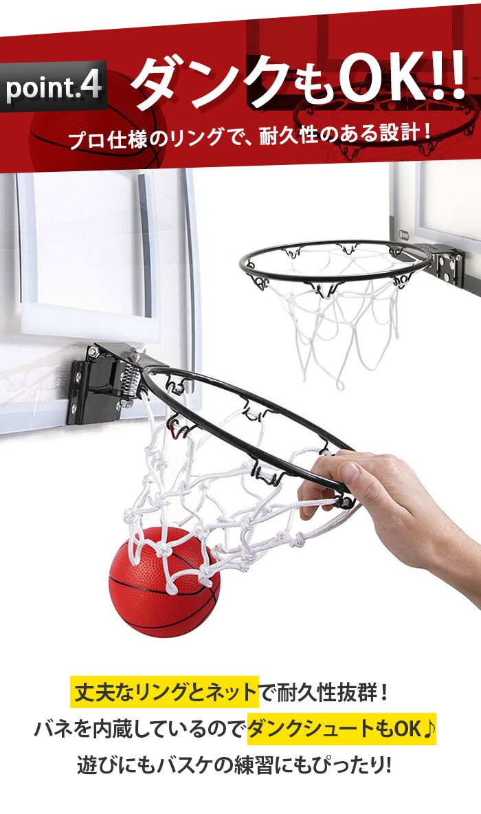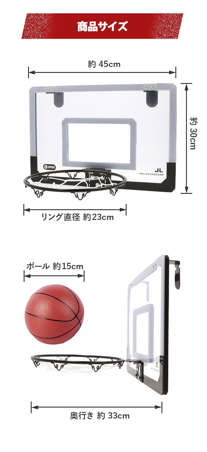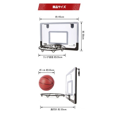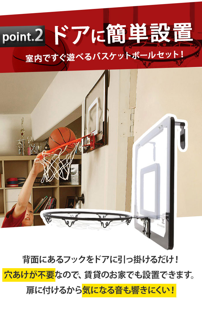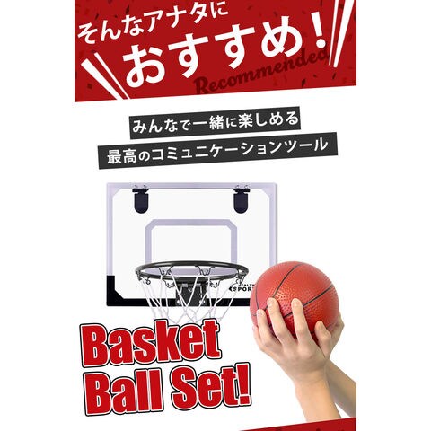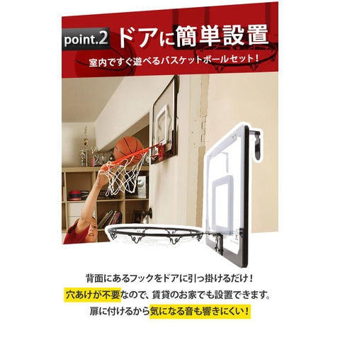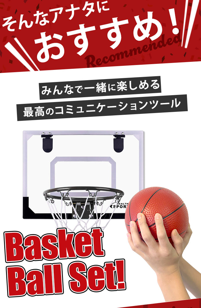 | 商品説明 | お部屋のドアに引っ掛けて使える!バスケットゴールセットが登場。付属のドライバーやレンチを使って、簡単組み立て!いつでもどこでもバスケットボールの練習ができちゃう♪雨が降って屋外で遊べない日も、家族や友人と一緒に室内で楽しめるのが嬉しい◎ゴールを決めれば、気分もスッキリ!ストレス解消にぴったりなアイテム。ミニサイズのバスケットボールや空気入れも付属。 |