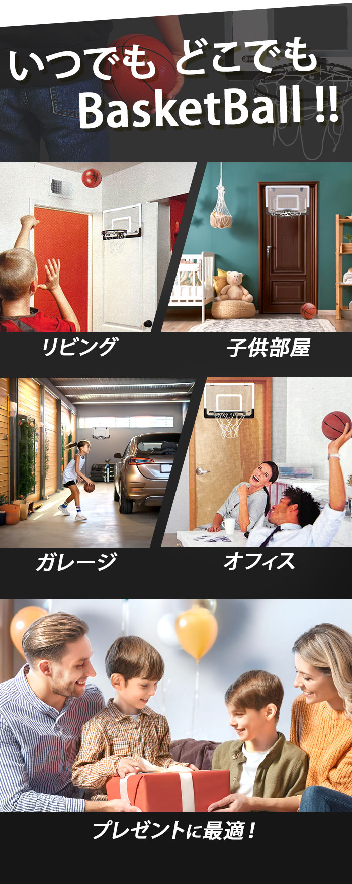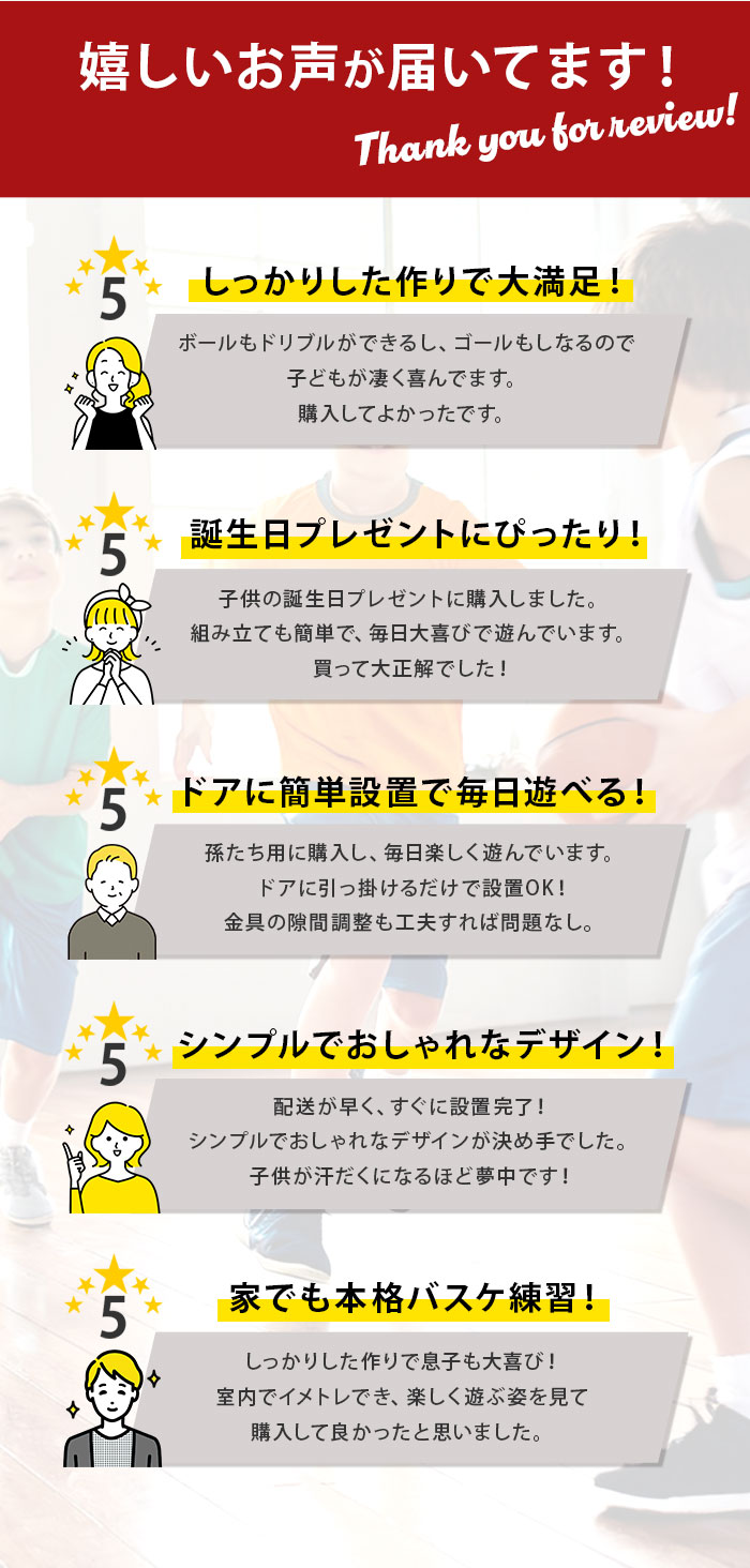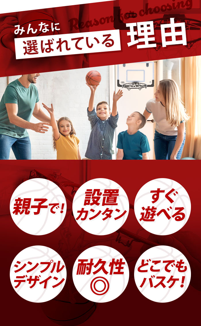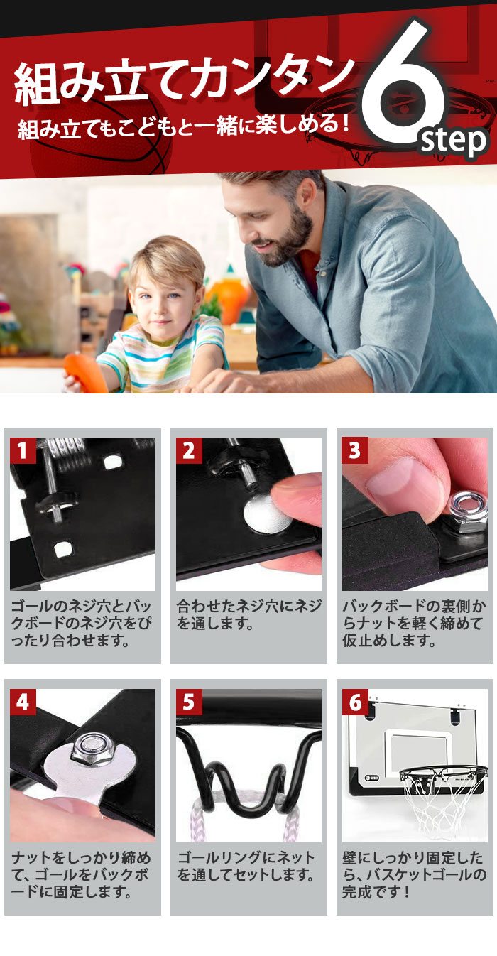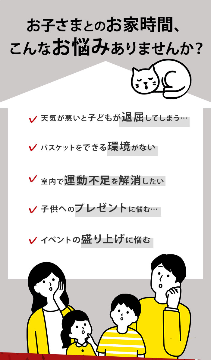 | 商品説明 | お部屋のドアに引っ掛けて使える!バスケットゴールセットが登場。付属のドライバーやレンチを使って、簡単組み立て!いつでもどこでもバスケットボールの練習ができちゃう♪雨が降って屋外で遊べない日も、家族や友人と一緒に室内で楽しめるのが嬉しい◎ゴールを決めれば、気分もスッキリ!ストレス解消にぴったりなアイテム。ミニサイズのバスケットボールや空気入れも付属。 |