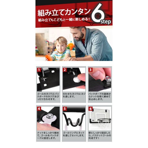 | 素材 | アルミニウム合金、プラスチック他 ※[セット内容] バスケットゴールリング、リングネット、バックボード、ポットフック×2個 ネジ(長)×1個、ナット(ネジ長用)×1個、ネジ×3個、ナット×3個 ポットフック用ネジ×4個、ドライバー、レンチ、空気入れ、ボール |