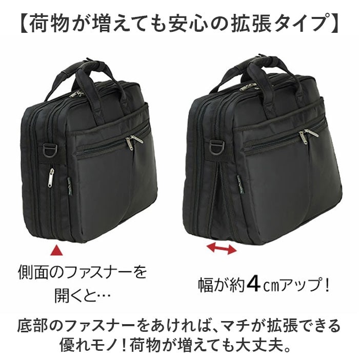 | 商品説明 | 【底部拡張タイプでしっかり収納◎】高機能バッグで充実のビジネスライフを!BLAZER CLUB ビジネスカジュアル 26702が登場。【荷物が増えても安心の拡張タイプ】底部のファスナーをあければ、マチが拡張できる優れモノ!荷物が増えても大丈夫。【B4ファイルやPCが入るサイズ感】大きめの資料もラクラク収納。クッションINのPCポケットつきで、電子機器の持ち運びも安心。【出張にも便利な2ルーム仕様】ビジネスグッズと衣類などを分けて収納できる、2ルーム仕様が嬉しいポイント。【シーンに合わせて2WAYチェンジ】取り外し可能のショルダー紐を搭載。ハンズフリーで動きたい時は簡単にチェンジ!【スタイリッシュなオールブラック】他の色を使わない、オールブラック仕様。洗練された大人の雰囲気が魅力。【出張もラクラク♪キャリーオン設計】背面にはループ付。キャリーオンができるので、持ち運びに便利!荷物が多くてもラクラク移動♪【ガバっと開く後方ルーム】平面側の収納は、ガバっと約45度にオープンできる作り。荷物の取り出しがスムーズに。【床に置いてもクタっとならない】自立するバッグなので、床に置いても様になる。ビジネスシーンに強い作り。【ポケット仕様】メイン後方:PCポケットメイン前方:メッシュオープンポケット×1フロント:ファスナーポケット×3(大ポケット内:オープンケット×3、ペンポケット×3)背面:オープンポケット×1 |