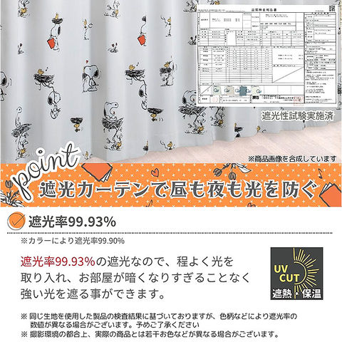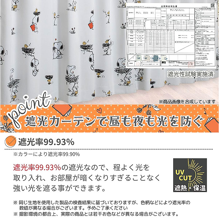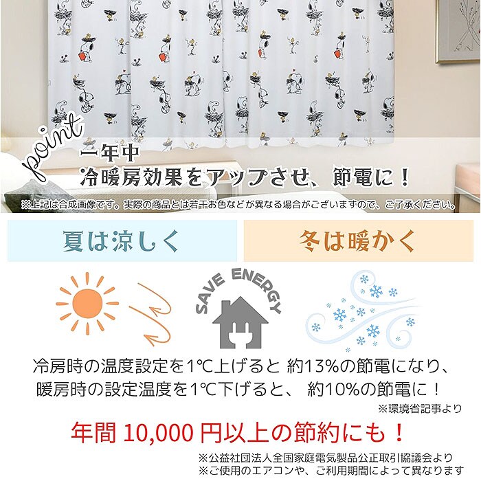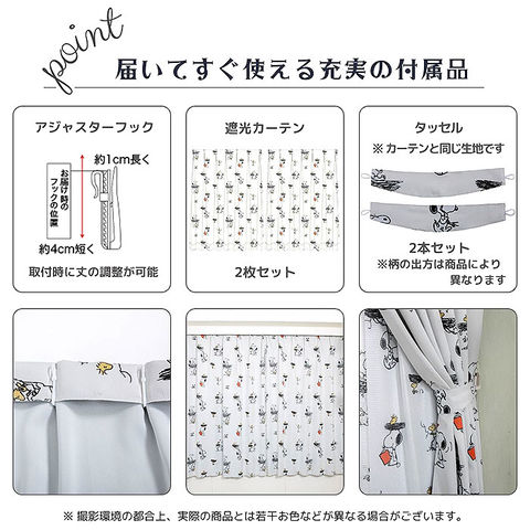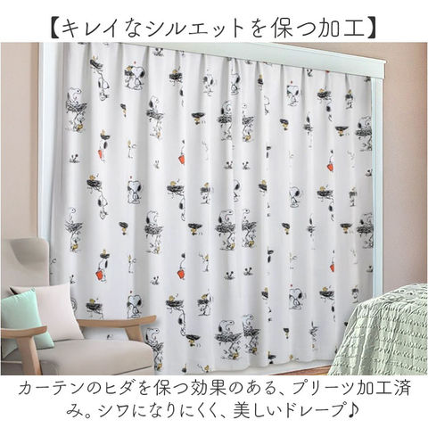 | 商品説明 | 【快適に過ごせて、可愛い空間に】程よく光を取り入れ、強い光を遮る!キャラクターデザインの「カーテン 2枚組」。【プライバシーを守る2級遮光】遮光率99.90%以上の2級遮光。日差しや街灯等も気になりにくく、外へ光を漏らしにくい!(※1)2級遮光:遮光率99.8~99.99%未満。本商品の遮光率はカラーにより、99.90%/99.93%と差異がございます。遮光率遮光用の糸を生地に使用しているため、少し色が暗く見える場合がございます。【夏は涼しく、冬は暖かく♪】遮光・遮熱効果のあるカーテンを取り付けることで、冷暖房効果をアップ!節電対策にも。【キレイなシルエットを保つ加工】カーテンのヒダを保つ効果のある、プリーツ加工済み。シワになりにくく、美しいドレープ♪【すぐに使えるアジャスターフック】カーテン用のアジャスターフックが付属。お部屋の窓のサイズに合わせて、丈感を調節。【カーテンをまとめるタッセル付き】カーテンと同じデザインのタッセル。カーテンを開ける時は、スマートにひとまとめ。【丸洗いできてお手入れラクラク】汚れが気になったらフックを外してネットに入れ、洗濯機洗い可能。いつも清潔をキープ◎(※2)脱水後はフックを取り付けてレールに沿って乾かすと、型崩れしにくくなります。【気分の上がるキャラクターデザイン】大人にも子供にも人気のキャラクター柄をプリント。お部屋の雰囲気をチェンジ! |