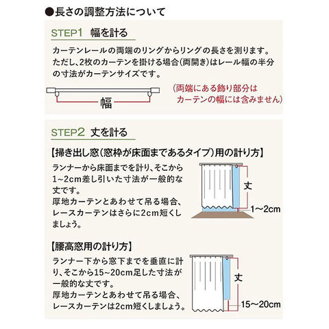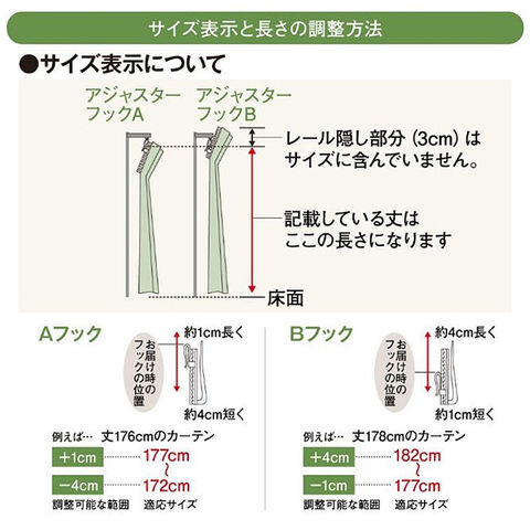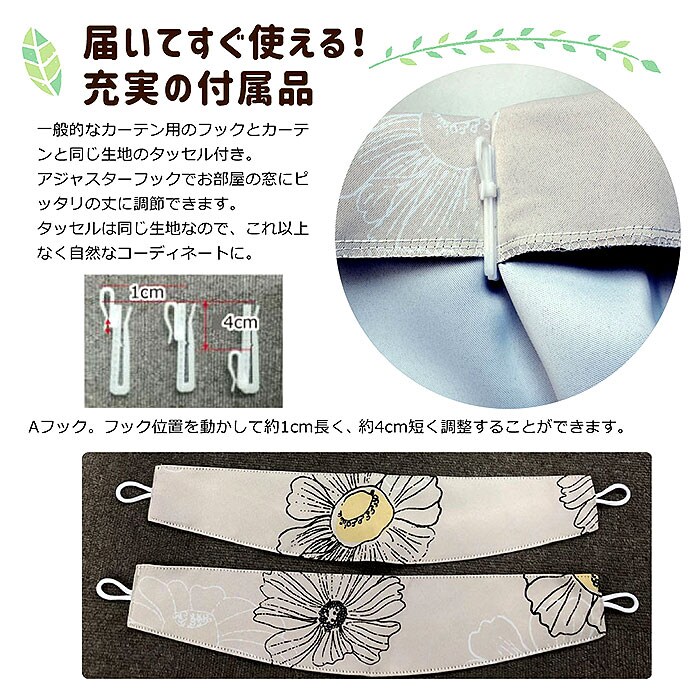 | 注意点 | [付属品]カーテンタッセル x 2個、アジャスターフック洗濯機 可 ドライクリーニング 不可乾燥機 不可長時間日光にあたったり、摩擦、水漏れなどによる色落ちや色移りすることがあります。お取り扱いの際は、商品やパッケージなどに記載されている品質表示、アテンションタグ、ご使用上の注意事項などを必ずご確認下さい。本来の目的以外にはご使用にならないで下さい。カメラやモニターの性質により、画像と実物の色の違いがある場合がございますのでご理解願います。 |