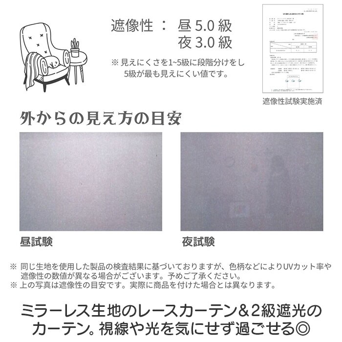 | 重量 | 【遮光カーテン】 約1500g(※商品一式の重量です。) 【レースカーテン】 約506g(※商品一式の重量です。) |