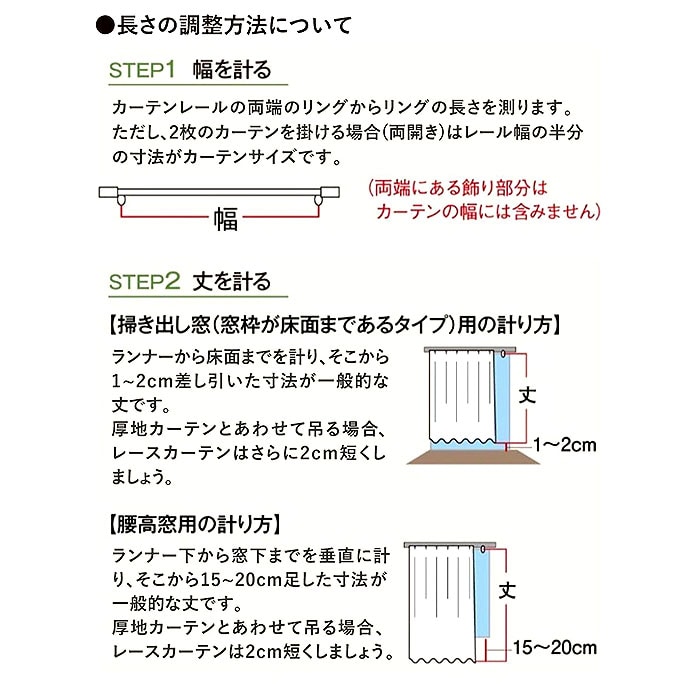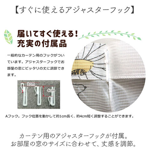 | 注意点 | [付属品]タッセル x 2個(遮光カーテンのみ)、アジャスターフック洗濯機 可ドライクリーニング 不可乾燥機 不可長時間日光にあたったり、摩擦、水漏れなどによる色落ちや色移りすることがあります。お取り扱いの際は、商品やパッケージなどに記載されている品質表示、アテンションタグ、ご使用上の注意事項などを必ずご確認下さい。本来の目的以外にはご使用にならないで下さい。カメラやモニターの性質により、画像と実物の色の違いがある場合がございますのでご理解願います。 |
