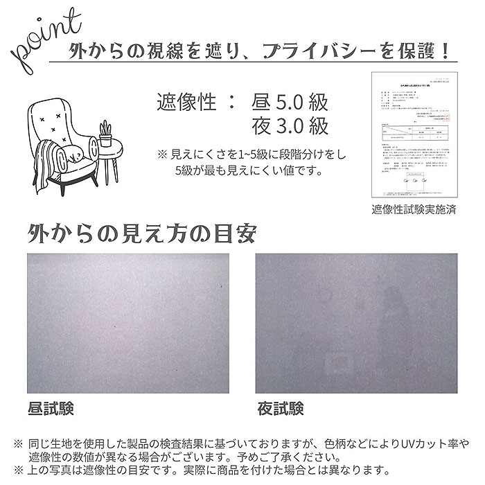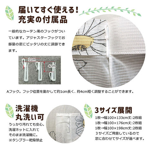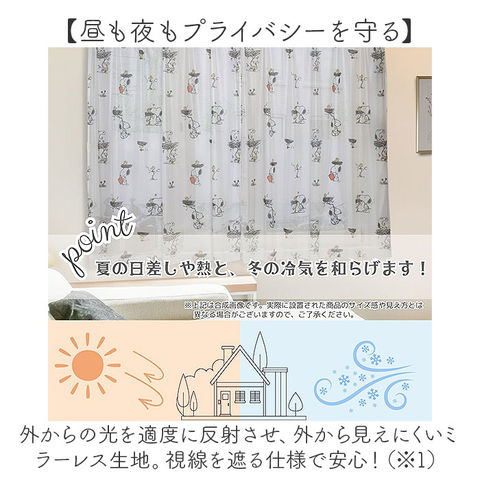 | 商品説明 | 【快適に過ごせて、可愛い空間に】強い光を遮り、視線も気にならない!キャラクターデザインの「レースカーテン 2枚組」。【昼も夜もプライバシーを守る】外からの光を適度に反射させ、外から見えにくいミラーレス生地。視線を遮る仕様で安心!(※1)遮像性:昼5.0級/夜3.0級。【夏は涼しく、冬は暖かく♪】遮光・遮熱効果のあるカーテンを取り付けることで、冷暖房効果をアップ!節電対策にも。【UVカットでお肌や壁の日焼け対策】UVカット率82.10%。強い光を和らげ、お肌や床、壁の日焼けも防止。【すぐに使えるアジャスターフック】カーテン用のアジャスターフックが付属。お部屋の窓のサイズに合わせて、丈感を調節。【丸洗いできてお手入れラクラク】汚れが気になったらフックを外してネットに入れ、洗濯機洗い可能。いつも清潔をキープ◎(※2)脱水後はフックを取り付けてレールに沿って乾かすと、型崩れしにくくなります。【気分の上がるキャラクターデザイン】大人にも子供にも人気のキャラクター柄をプリント。お部屋の雰囲気をチェンジ! |