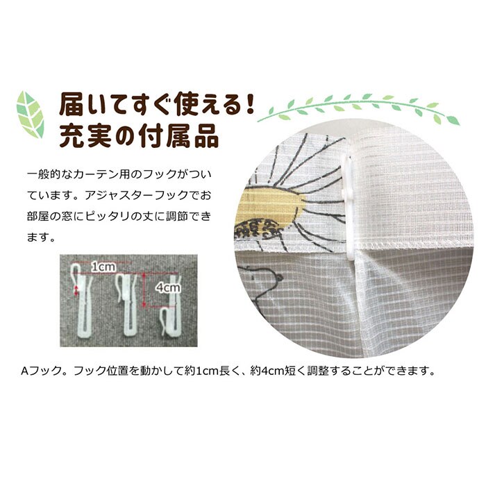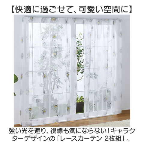 | 商品説明 | 【快適に過ごせて、可愛い空間に】強い光を遮り、視線も気にならない!キャラクターデザインの「レースカーテン 2枚組」。【昼も夜もプライバシーを守る】外からの光を適度に反射させ、外から見えにくいミラーレス生地。視線を遮る仕様で安心!(※1)遮像性:昼5.0級/夜3.0級。【夏は涼しく、冬は暖かく♪】遮光・遮熱効果のあるカーテンを取り付けることで、冷暖房効果をアップ!節電対策にも。【UVカットでお肌や壁の日焼け対策】UVカット率82.10%。強い光を和らげ、お肌や床、壁の日焼けも防止。【すぐに使えるアジャスターフック】カーテン用のアジャスターフックが付属。お部屋の窓のサイズに合わせて、丈感を調節。【丸洗いできてお手入れラクラク】汚れが気になったらフックを外してネットに入れ、洗濯機洗い可能。いつも清潔をキープ◎(※2)脱水後はフックを取り付けてレールに沿って乾かすと、型崩れしにくくなります。【気分の上がるキャラクターデザイン】大人にも子供にも人気のキャラクター柄をプリント。お部屋の雰囲気をチェンジ! |
