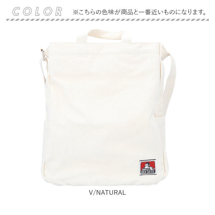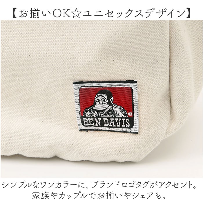 商品説明【サッと持ち出せてお出かけの相棒に】カジュアル感たっぷりで、デイリーに使える!「BEN DAVIS 2WAY TOTE」。【持っていればヘビロテ間違いなし】ナチュラルな風合いのコットンキャンバス生地。丈夫でガシガシ使えて、シーズンレスで活躍。【お好みに合わせてスタイルチェンジ】手持ちはもちろん!長さ調節可能なベルトを使って、肩掛けや斜め掛けも自在な2wayタイプ。【開閉スムーズ、安心の天ファスナー】ガバっと開いて取り出しやすく、ファスナーを閉じればセキュリティ面も安心。【うれしいA4サイズ対応】内側はA4サイズが縦向きにすっぽり。お出かけに必要な荷物が、すっきりひとまとめ◎【サッと取り出せて迷子知らず】内側・外側合わせて3つのポケット配置。バッグの中で小物を探す手間が不要。【お揃いOK☆ユニセックスデザイン】シンプルなワンカラーに、ブランドロゴタグがアクセント。家族やカップルでお揃いやシェアも。【ポケット仕様】内側:オープンポケット×1サイド:オープンポケット×2