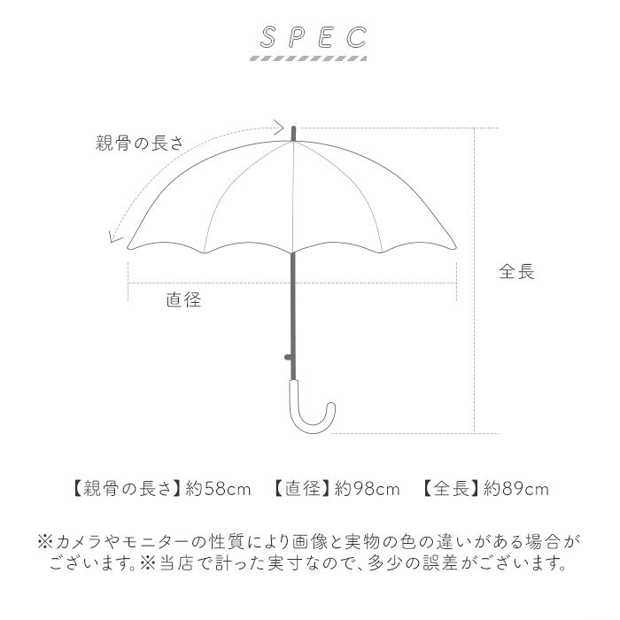 | サイズ | [親骨の長さ]約58cm/[直径]約98cm/[全長]約89cm ※サイズは当店計測の実寸サイズです。実際の商品ならびにメーカー表記サイズとは多少の誤差が生じる場合がございます。あらかじめご了承ください。 |