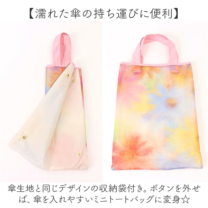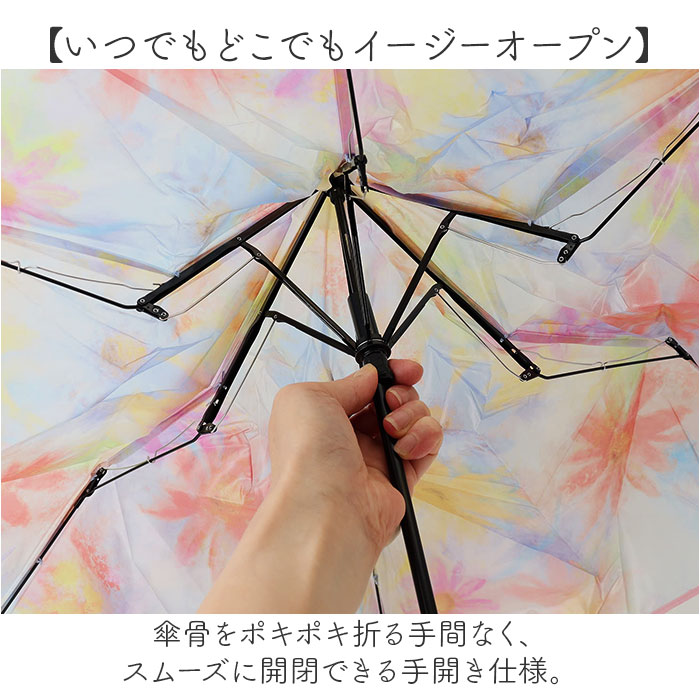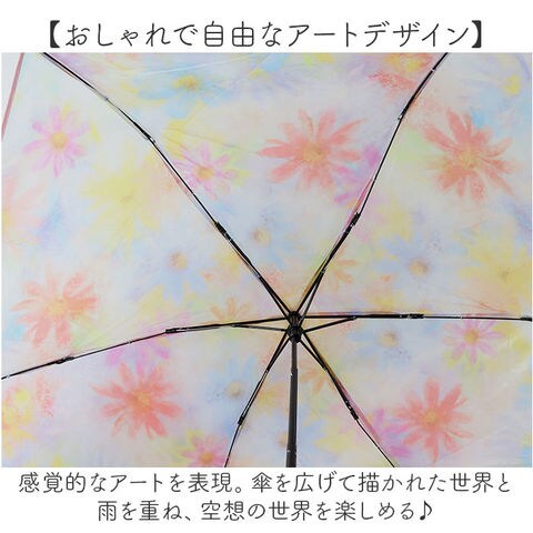 商品説明【憂鬱な雨の日も気分がアップ♪】涼しげで可愛らしいデザインが魅力◎「because クリアアンブレラ 折りたたみ傘」。【おしゃれで自由なアートデザイン】感覚的なアートを表現。傘を広げて描かれた世界と雨を重ね、空想の世界を楽しめる♪【いつでもどこでもイージーオープン】傘骨をポキポキ折る手間なく、スムーズに開閉できる手開き仕様。【安心・安全のセーフガード機能】爪や指を挟むのを防止するカバーを装備。開閉時のケガを防ぎ、ネイルを施した爪も保護。【サクッと留められるボタン式バンド】傘生地を留めるバンドは、バチンっと留めやすいスナップボタン式。【持ちやすく保管もラクラク】手元に馴染みやすい、華奢なJ字ハンドル。掛けて保管することもできて便利。【濡れた傘の持ち運びに便利】傘生地と同じデザインの収納袋付き。ボタンを外せば、傘を入れやすいミニトートバッグに変身☆【温かみのあるデザインで華やかに】マットな質感に、水彩タッチのニュアンス柄。雨の日も晴れやかな気持ちでお出かけ♪