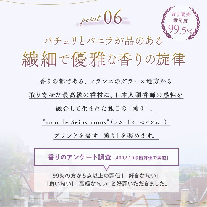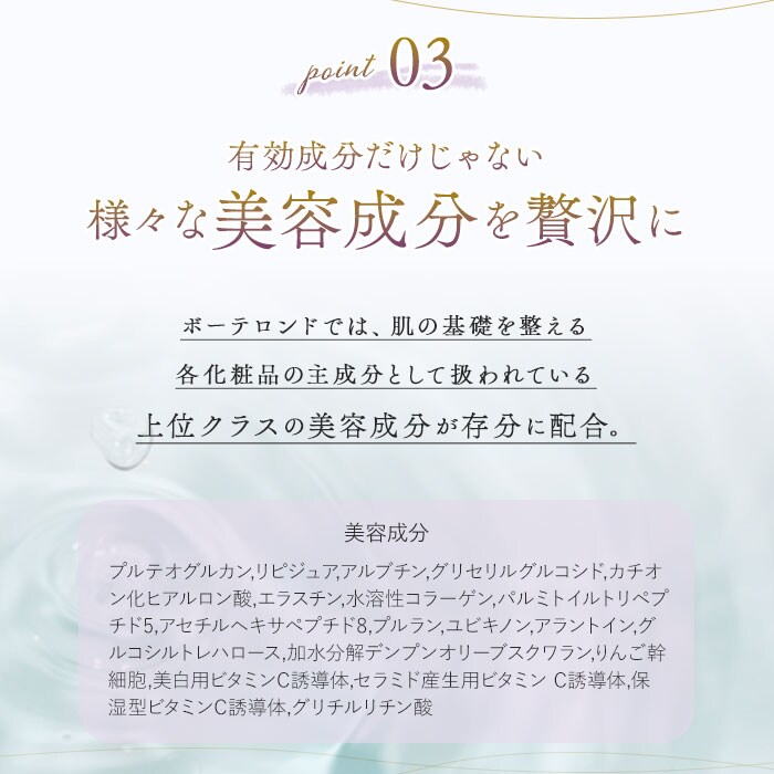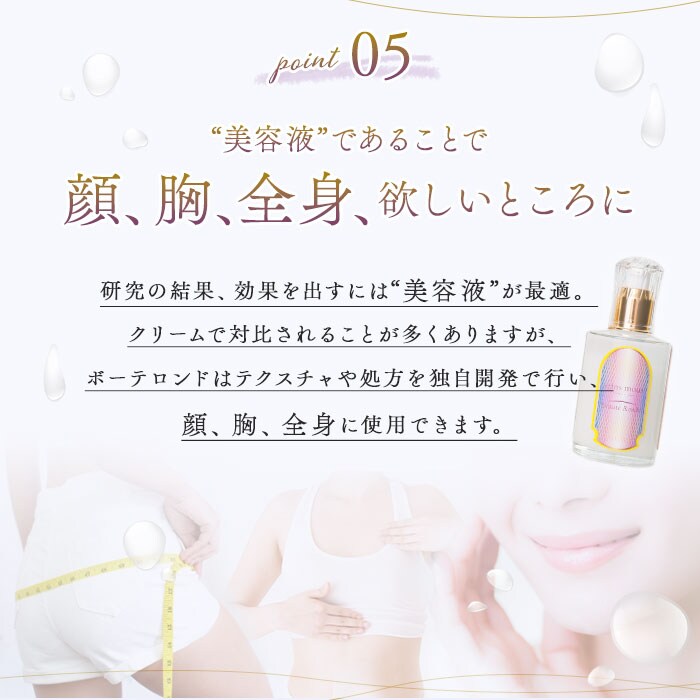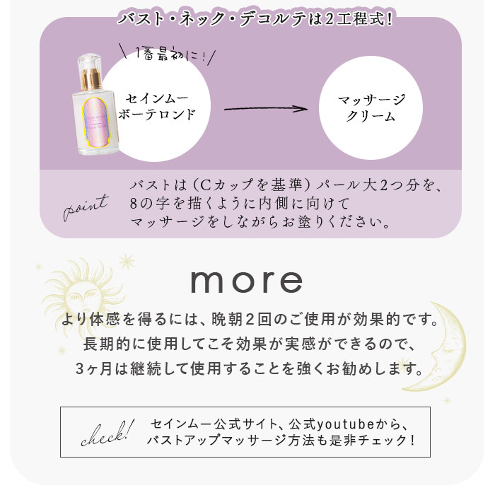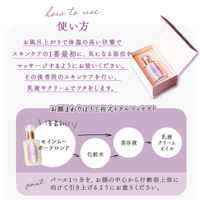 商品説明結果を追求するコスメブランド「セインムー」から、3つの成分を日本最高濃度で配合したバストセラム「ボーテロンド」100mlが新登場。美容成分を追加しスキンケア力も向上させた、バストケア美容液。「有効成分×エビデンス=結果」という研究をもとにした、高機能化粧品!安心の日本製!バストにアプローチする日本最高濃度の3つの有効成分「ボルフィリン、アデフィリン、セルアクティブ」をふんだんに使用。ハリ、潤い、保湿成分が素肌に浸透!お風呂上がり、洗浄後1番に、気になる部分になじませてマッサージ♪バストだけでなく、フェイスやボディのケアにもおすすめ◎セインムーブランド、オリジナルの香水「ム・ドゥ・セインムー」の香りを配合。包み込むような美しいかおり♪約6ヶ月を目安に使える、容量100ml。高級感漂うボックス入りで、プレゼントにも喜ばれるアイテム。
