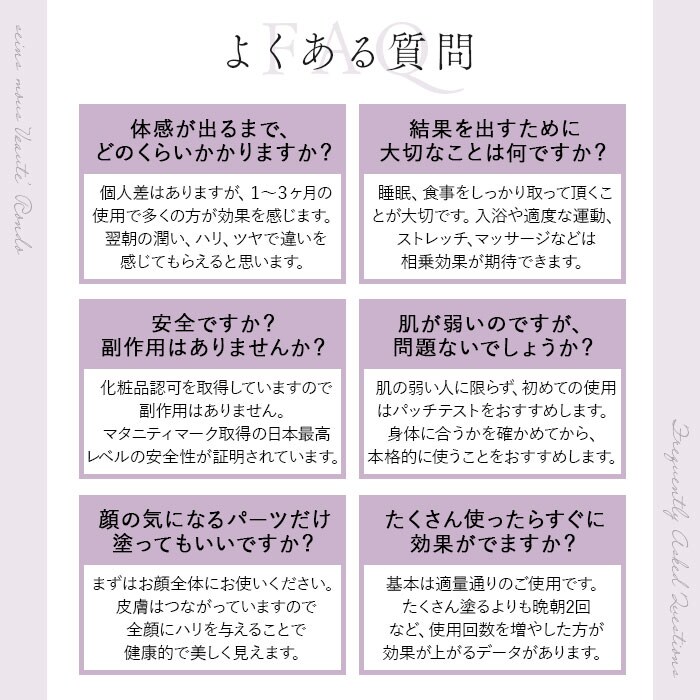 注意点お肌に異常が生じてないかよく注意してご使用ください。お肌に合わない場合はご使用をおやめください。赤み、はれ、かゆみ、刺激、色抜け(白斑等)や黒ずみ等の異常があらわれた場合はご使用を中止し、皮膚科専門医などにご相談されることをおすすめします。お取り扱いの際は、商品やパッケージなどに記載されている品質表示、アテンションタグ、ご使用上の注意事項などを必ずご確認下さい。本来の目的以外にはご使用にならないで下さい。カメラやモニターの性質により、画像と実物の色の違いがある場合がございますのでご理解願います。