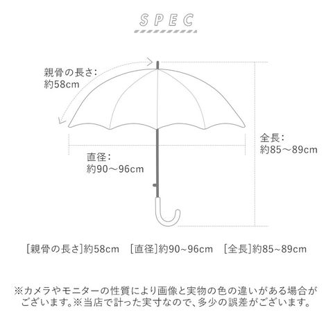 | サイズ | [親骨の長さ]約58cm/[直径]約90cm~約96cm [全長]約85cm~約89cm ※種類によって大きさが若干異なります。 ※サイズは当店計測の実寸サイズです。実際の商品ならびにメーカー表記サイズとは多少の誤差が生じる場合がございます。あらかじめご了承ください。 |