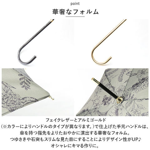 | 商品説明 | オシャレなデザインで雨の日も楽しく♪晴雨兼用ロングアンブレラが発売♪(親骨58cm)【晴雨兼用】紫外線カット率約80%以上でオールシーズン・晴れの日も使えるアイテム!【スムーズな手開きタイプ】手開きに加え、安全カバー付きで指を挟まず安全に開閉可能♪【留めバンド】パチッとしっかり留められるスナップボタン式。【華奢なフォルム】フェイクレザーとアルミゴールド(※カラーによりハンドルのタイプが異なります。)で仕上げた手元ハンドルは、傘を持つ指先をよりたおやかに演出する華奢なフォルム。つゆさきや石突もスリムな見た目にすることによりデザイン性がUP♪オシャレにキマる作りに。【雨の日も楽しめる】雨の日が楽しくなっちゃう豊かな色彩のオリジナルテキスタイル。カジュアルからエレガントまで充実したラインナップが嬉しい♪ |