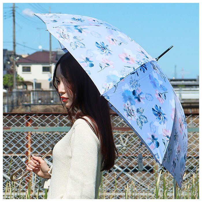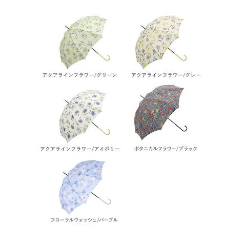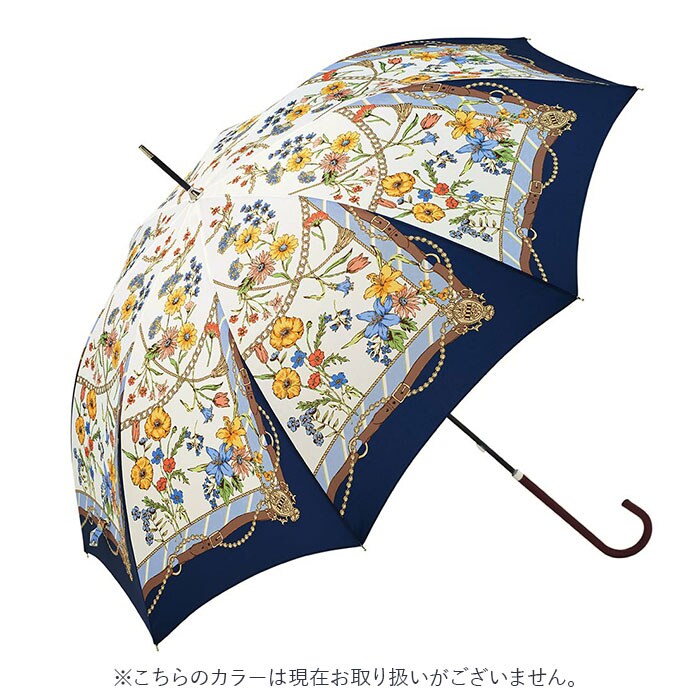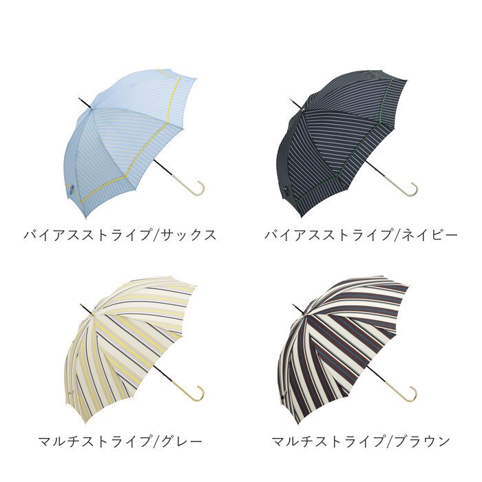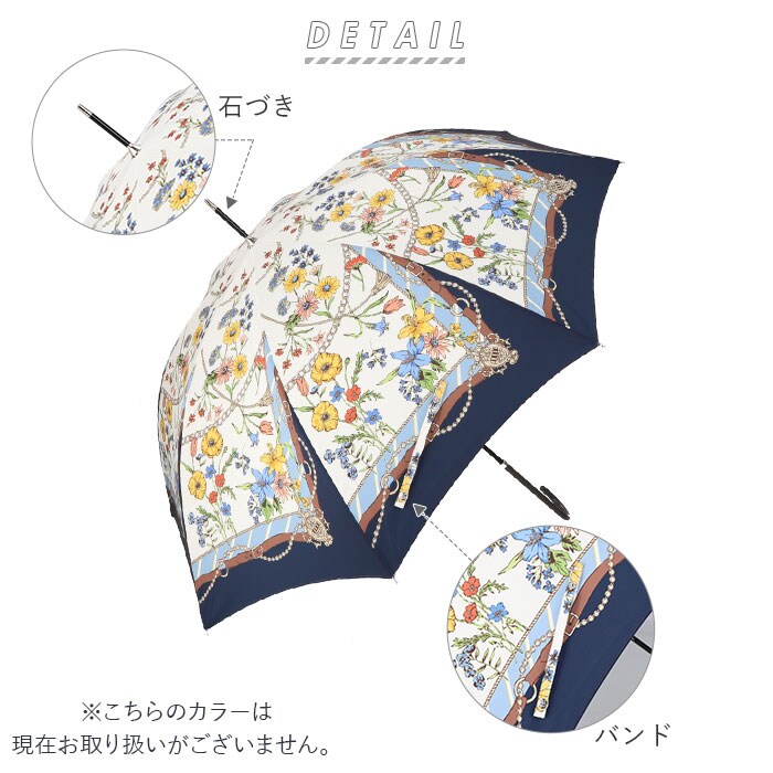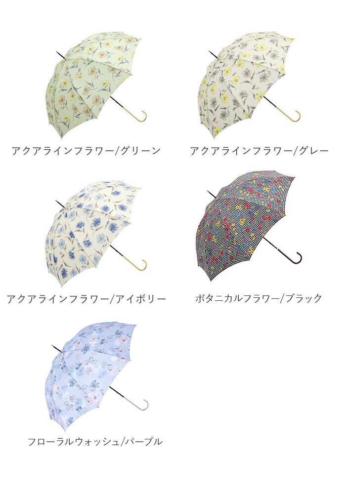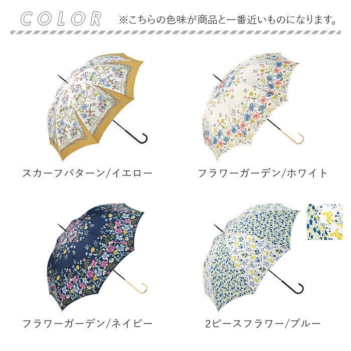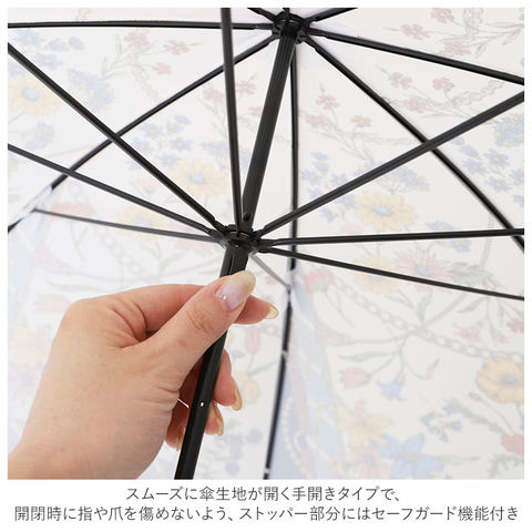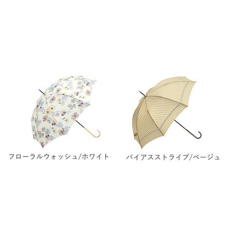 | 注意点 | 製品には尖った部分があります。常に周囲の安全を確認してご使用下さい。傘の開閉時には、顔や身体から離して使用して下さい。傘生地には防水撥水加工を施し、縫製には撥水糸を使用していますが、激しい雨や長時間のご使用では雨が染み込むことがございます。また飾り加工部分(刺繍、ステッチ、バイピング、テープ等)はデザインの特性上、完全な防水撥水加工が難しい場合があり雨が染みやすいのでご注意下さい。ハンドクリームや日焼け止めクリーム等が、生地・手元の色落ちの原因になる場合があります。ステッキがわりに使用しないで下さい。手元、または骨の先端等が壊れたまま使用しないで下さい。振り回したり投げたりしないで下さい。強風の時は破損する恐れがありますので、注意してご使用下さい。ご使用後は陰干しして充分に乾燥させて下さい。濡れたまま放置すると生地の防水、撥水力の低下や骨の劣化につながります。製品には構造上、骨同士が狭くなっている箇所がありますので、手や指を挟まない様に充分に注意してご使用下さい。傘骨にグラスファイバーを使用している場合は、破損した際に破損部分を触るとトゲが刺さる場合がありますので、直接触らないようにして下さい。ご使用の際は、生地をほぐしてから開閉して下さい。無理に開くと骨が折れたり、傘全体に負担がかかる原因となります。傘は必ず手に持ってご使用下さい。お子様には保護者の方からご注意下さい。カメラやモニターの性質により、画像と実物の色の違いがある場合がございますのでご理解願います。 |
