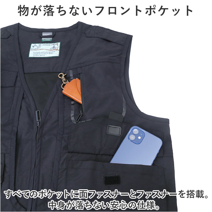 | 商品説明 | 釣りや登山、アウトドアで活躍☆ポケットがいっぱいで高機能の、ベストが登場。【驚くほどのポケット数!機能性◎】ベストのあらゆるところにポケットを配置。スマホや作業用小物などポケットにINできる!【軽い着心地で動きやすい】内側はメッシュ素材で、ムレを防止し、軽量化を実現。軽い着心地だから動きやすい!【物が落ちないフロントポケット】すべてのポケットに面ファスナーとファスナーを搭載。中身が落ちない安心の仕様。【鍵などが掛けられるDカンを搭載】Dカンを複数搭載。鍵などがかけられ、ハンズフリーで動ける。細部までこだわった機能性◎【着ぶくれしにくいシルエット】着ぶくれしにくいすっきりシルエットなので、アウターの中に着込んでも◎ロングシーズンOK。【シーンや性別を選ばないデザイン】シンプルなデザインなので、幅広いシーンでの使用が可能。ユニセックスで使うのもオススメ。【ポケット仕様】フロント:面ファスナーフラップポケット×3、面ファスナーポケット×2、ファスナーポケット×1内側:面ファスナーポケット×1 |