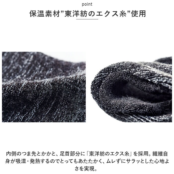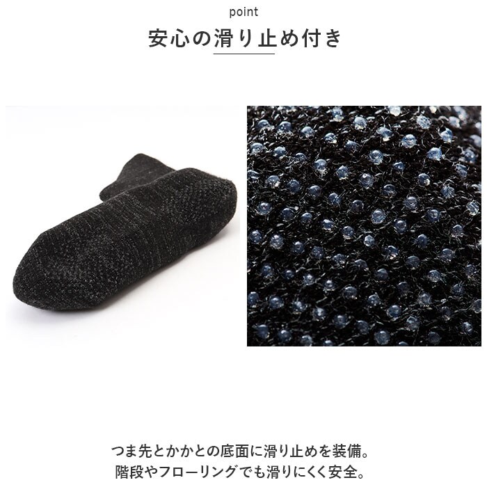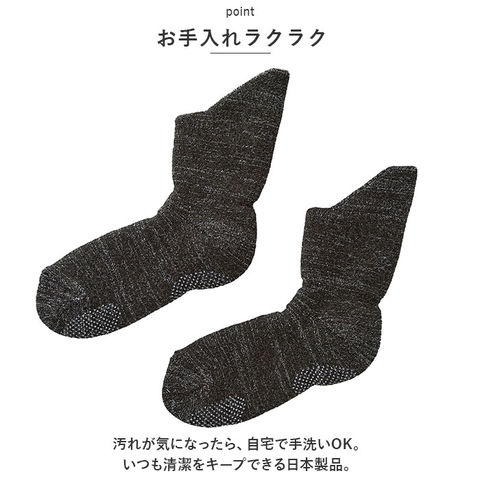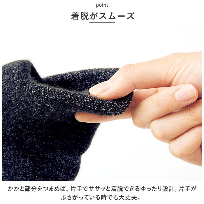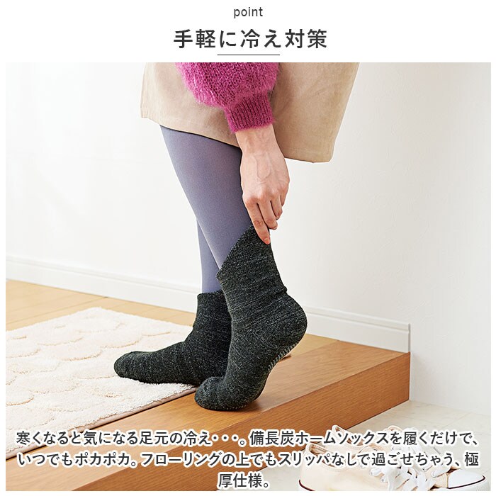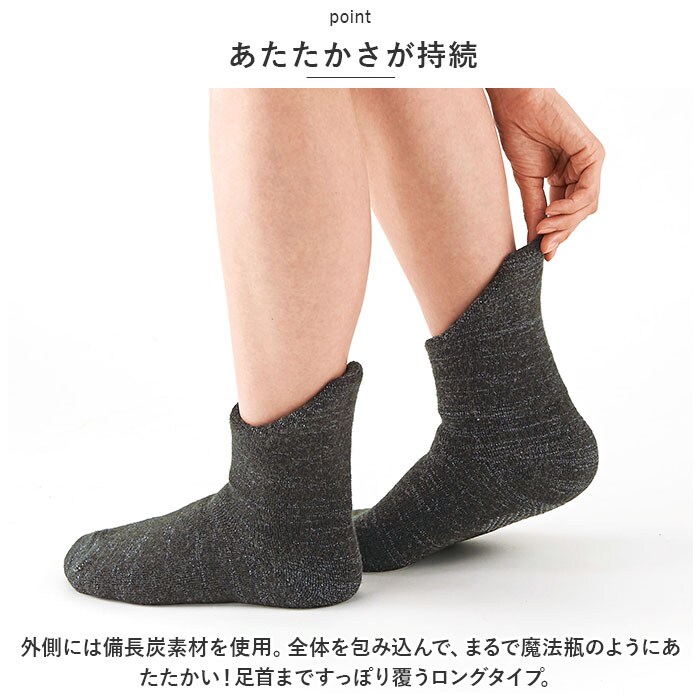 | 商品説明 | 機能性素材&備長炭の二重構造で、魔法瓶のようなあたたかさをキープ♪足首までポカポカ、スリッパ代わりになる「備長炭ホームソックス 足首ロング」が新登場。【手軽に冷え対策】寒くなると気になる足元の冷え・・・。備長炭ホームソックスを履くだけで、いつでもポカポカ。フローリングの上でもスリッパなしで過ごせちゃう、極厚仕様。【保温素材”東洋紡のエクス糸”使用】内側のつま先とかかと、足首部分に「東洋紡のエクス糸」を採用。繊維自身が吸湿・発熱するのでとってもあたたかく、ムレずにサラッとした心地よさを実現。【あたたかさが持続】外側には備長炭素材を使用。全体を包み込んで、まるで魔法瓶のようにあたたかい!足首まですっぽり覆うロングタイプ。【着脱がスムーズ】かかと部分をつまめば、片手でササッと着脱できるゆったり設計。片手がふさがっている時でも大丈夫。【安心の滑り止め付き】つま先とかかとの底面に滑り止めを装備。階段やフローリングでも滑りにくく安全。【お手入れラクラク】汚れが気になったら、自宅で手洗いOK。いつも清潔をキープできる日本製品。 |