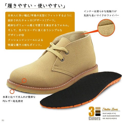| 商品説明 | 【幅広いコーデに合わせやすい】トレンドに左右されることなく履ける!「Bullet Jamのデザートブーツ」。【足元をおしゃれに格上げ】靴の表面は起毛素材。絶妙なボリューム感と可愛いフォルムも魅力的〇※起毛素材を使用しているため、毛羽立ち、擦れ、若干の色ムラ等がございます。素材の特性上避けられない部分のため予めご了承ください。【なめらかな肌触り】内側は滑らかな肌触りのマイクロファイバー素材で気持ちいい履き心地。【履きやすさ抜群】日本人に多い幅広・甲高の足にフィットするよう設計されていて歩行も快適◎【安定感のある歩行】低めのヒールと程よい厚みのアウトソールで安定した歩きやすさを実現!【通気性の良い素材】取り外し可能なメッシュインソールでムレによる不快感を軽減。【クッション性抜群】インソールの裏側は立体的な網目構造で衝撃吸収と弾力性に優れていて歩行が軽やか! |