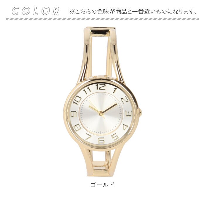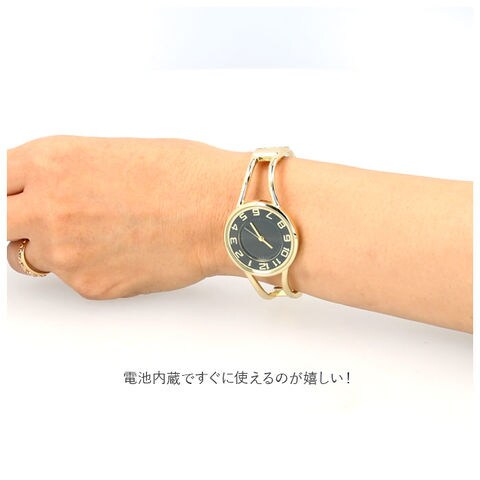 | 商品説明 | 程よい抜け感で女性らしい雰囲気を演出するバングルウォッチ♪アクセサリー感覚で身につけられるバングルタイプ。バングルを開くだけでワンタッチ着脱!忙しい朝もサッと腕に付けてお出かけ♪日本製ムーブメントを採用。バングル、時針分針秒針、文字盤数字などのカラーを統一することで、上品な印象に。シンプルですっきりとした文字盤デザイン。時刻を確認しやすいのもポイント。電池内蔵ですぐに使えるのが嬉しい!(※生産時に正常な電池を組み込んでおりますが、お買い上げいただくまでの期間も作動し続けているため、ある程度は電池を消耗しております。)キレイめコーデと相性ばっちり。 |