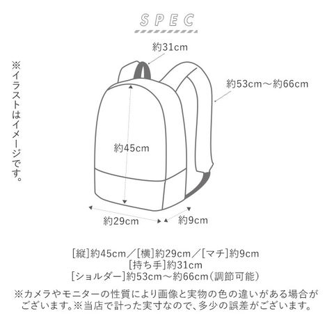| サイズ | [縦]約45cm/[横]約29cm/[マチ]約9cm [ショルダー]約53cm~約66cm(調節可能) ※サイズは当店平置き実寸サイズです。実際の商品ならびにメーカー表記サイズとは多少の誤差が生じる場合がございます。あらかじめご了承ください。 |