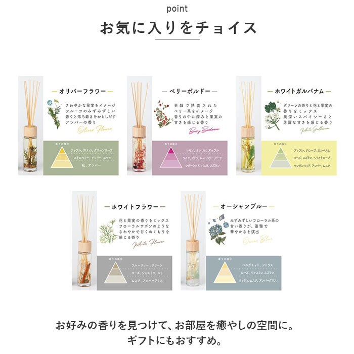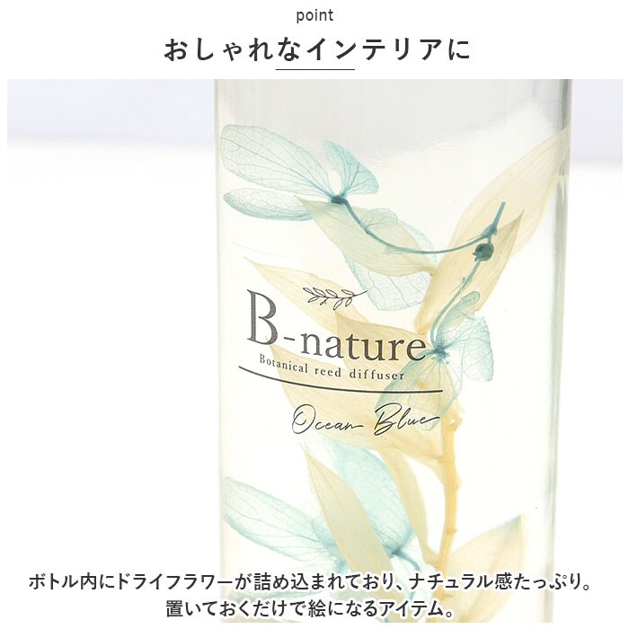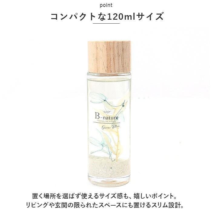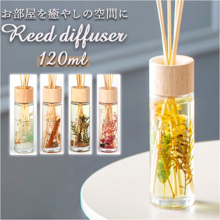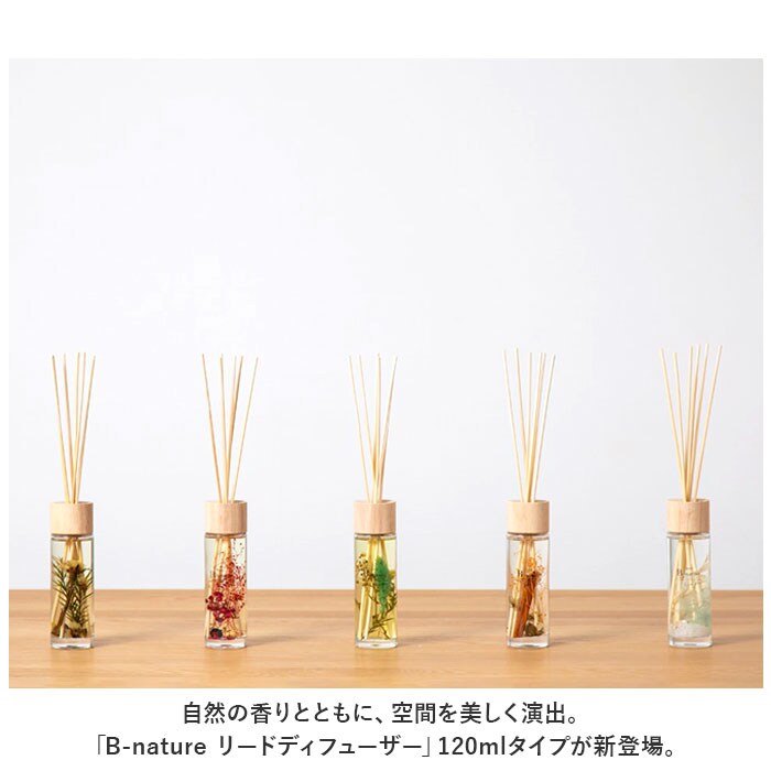 | 商品説明 | 自然の香りとともに、空間を美しく演出。「B-nature リードディフューザー」120mlタイプが新登場。【ボタニカルシリーズ】ふわっと自然の息吹を、自宅で感じることのできるシリーズ。心地よい香りが広がり、疲れた心もリラックス。【使い方は簡単】ボトルの栓を外し、スティックを挿入するだけ。スティックの本数で香りの強さを調節可能。芳香期間は約1.5ヶ月。(※使用環境などにより異ります。)【おしゃれなインテリアに】ボトル内にドライフラワーが詰め込まれており、ナチュラル感たっぷり。置いておくだけで絵になるアイテム。【コンパクトな120mlサイズ】置く場所を選ばず使えるサイズ感も、嬉しいポイント。リビングや玄関の限られたスペースにも置けるスリム設計。【お気に入りをチョイス】お好みの香りを見つけて、お部屋を癒やしの空間に。ギフトにもおすすめ。 |
