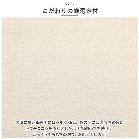 | 商品説明 | 素肌と地球に優しい♪日本製のボディタオル「Hyva シルクボディタオル」が新登場。【こだわりの厳選素材】お肌に当たる表面にはシルク35%、糸の芯には泡立ちの良いトウモロコシを原料としたポリ乳酸65%を使用。ふっくらもちもちの泡で、お肌ピカピカ☆【ピーリング効果も】お肌全体のザラツキが気になる時や、ターンオーバ?を促したい時にもおすすめ◎【デイリー使いにぴったり】お湯を含ませよく揉んだボディタオルに、お手持ちのボディーソープや石鹸をつけ、優しくマッサージするように洗うだけ♪【ちょっとしたギフトに】エコなイメージにぴったりな、清潔感のあるパッケージ仕様。性別や年代問わず贈り物に最適。 |